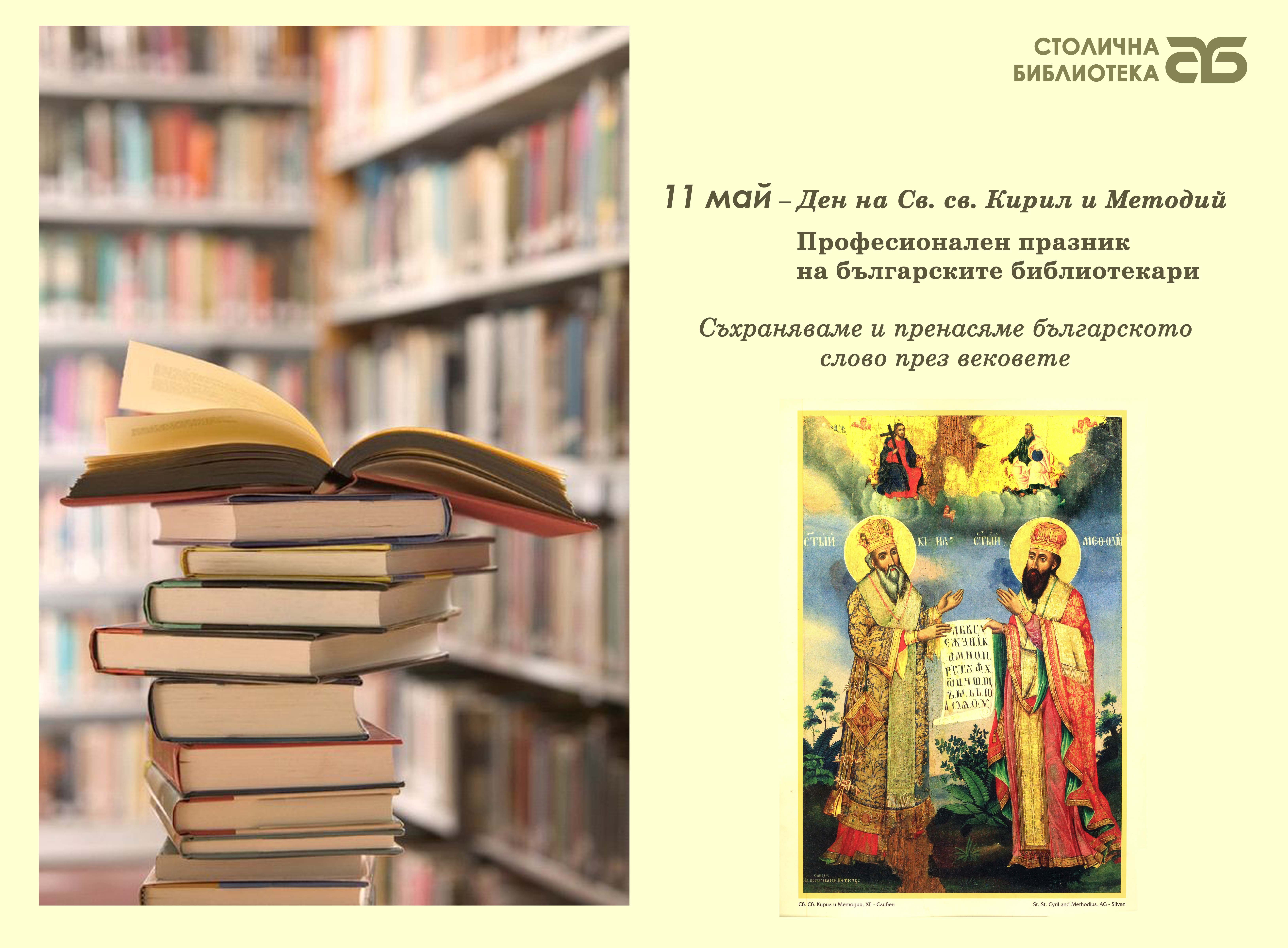В Деня на Светите братя Кирил и Методий и на професионалния празник на българските библиотекари – 11 май, най-голямата публична библиотека в страната – Столична библиотека – представя празнична програма „Съхраняваме и пренасяме българското слово през вековете“ и Ден на отворените врати.