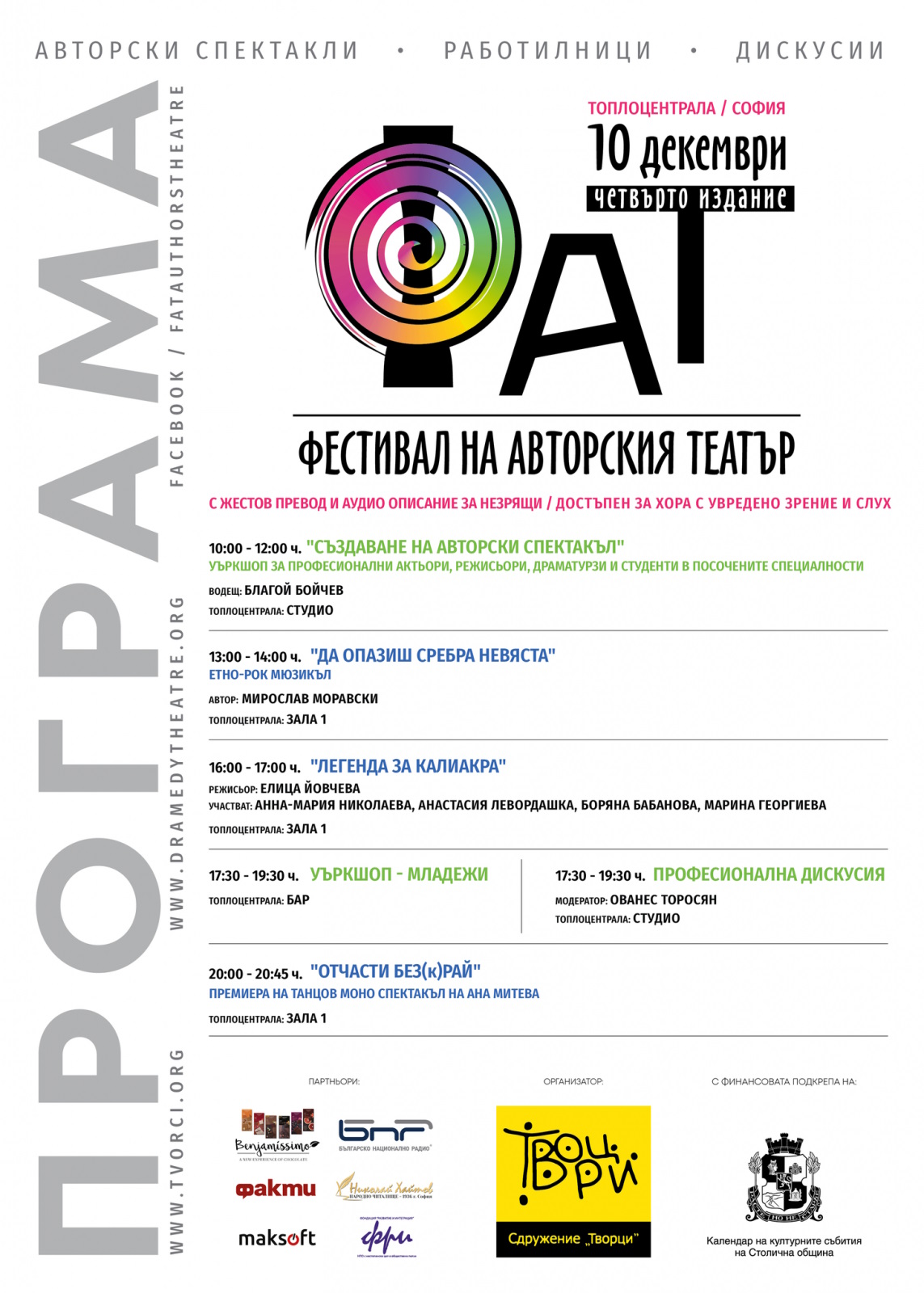 На 10 декември от 10:00 ч. до 22:00 ч. в Регионалния център за съвременни изкуства "Топлоцентрала" ще се проведе четвъртото издание на Фестивал на авторския театър – ФАТ.