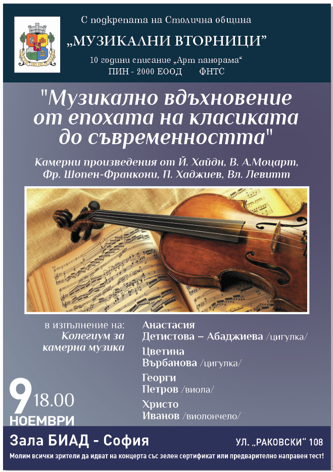 В зала БИАД от 18:00 ч. Колегиум за камерна музика ще изпълни произведения от класиката и романтизма – Хайдн, Моцарт и Шопен, както и прекрасния квартет от П. Хаджиев.