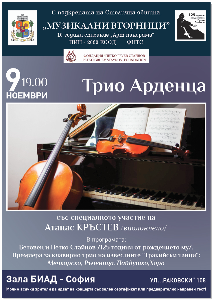 От 19:00 ч. Трио „Арденца“ за първи път в София ще изпълни във варианта за клавирно трио емблематичните „Тракийски танци” от Петко Стайнов, с които ще бъде отбелязан 125-годишния юбилей на големия български композитор.