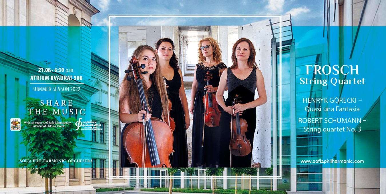 На 21 август (неделя) от 18:30 часа в атриума на "Квадрат 500" струнен квартет „Фрош“ ще изнесе концерт в летния сезон на Софийската филхармония.