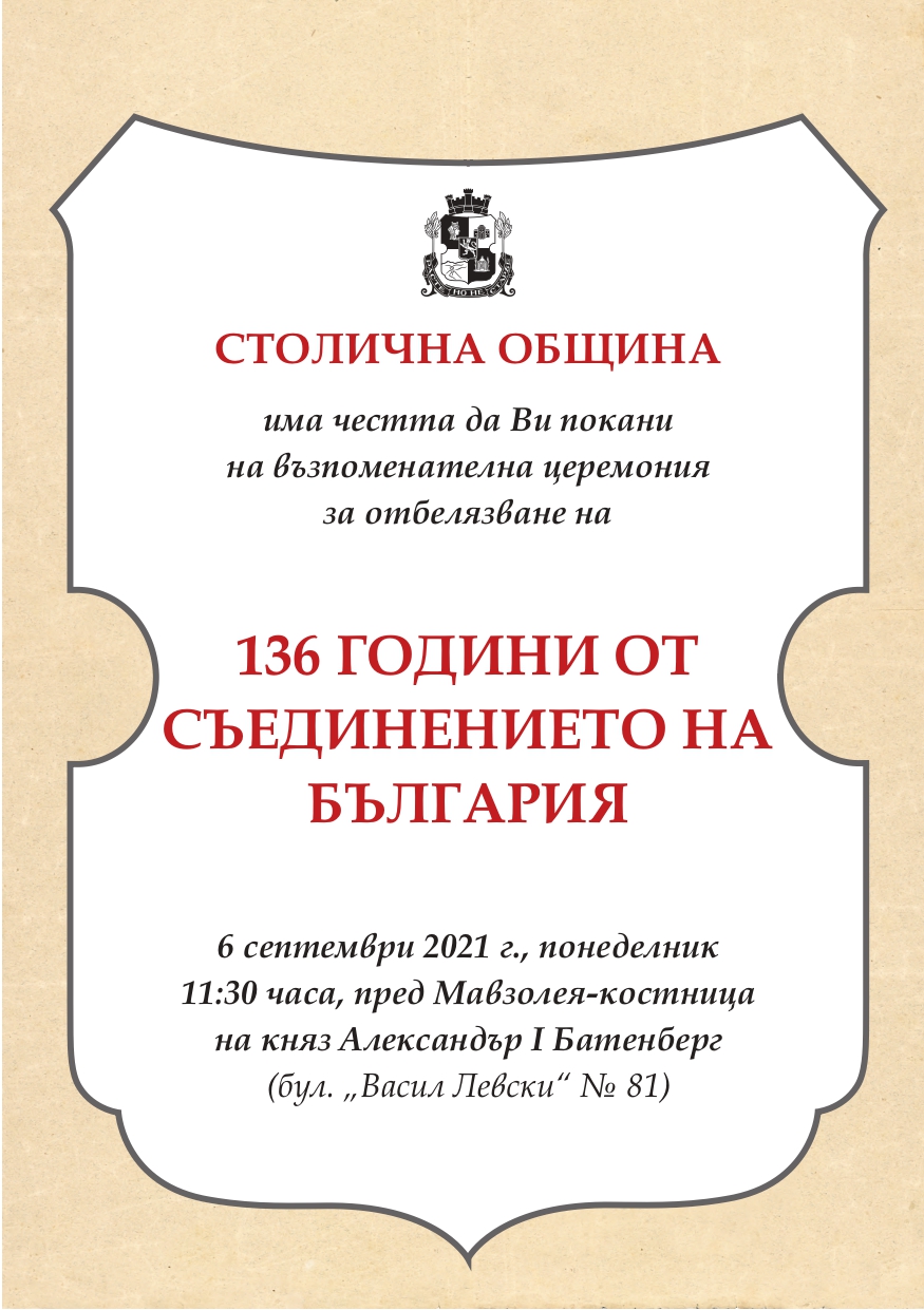 Столична община организира тържествено отбелязване на 136-ата годишнина от Съединението на Източна Румелия с Княжество България.