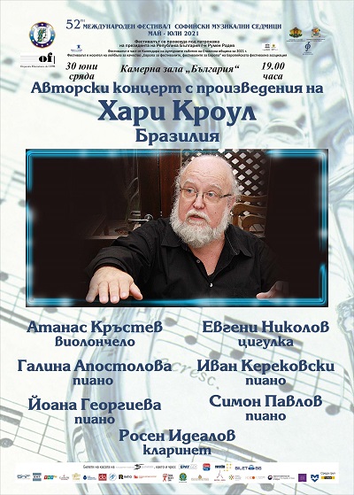 30 юни (сряда), 19 ч. – Камерна зала „България“ – Авторски концерт с произведения на Хари Кроул (Бразилия), с участието на Атанас Кръстев – виолончело, Евгени Николов – цигулка, Галина Апостолова – пиано, Иван Керековски – пиано, Йоана Георгиева – пиано, Симон Павлов – пиано, Росен Идеалов – кларинет