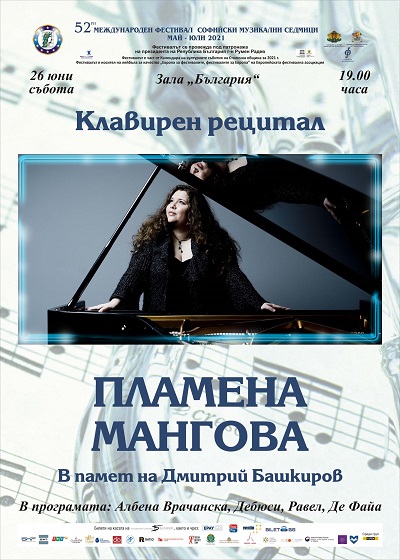 26 юни (събота), 19 ч. – Зала „България“ – Клавирен рецитал на Пламена Мангова. В програмата: Албена Врачанска, Дебюси, Равел, Де Файа