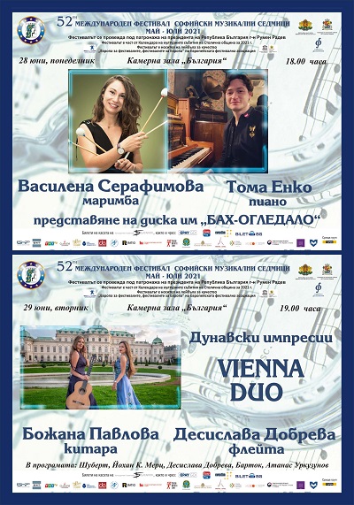 28 юни (понеделник), 18 ч. – Камерна зала „България“ – Концерт на Василена Серафимова – маримба и Тома Енко – пиано и представяне на диска им „Бах-Огледало“