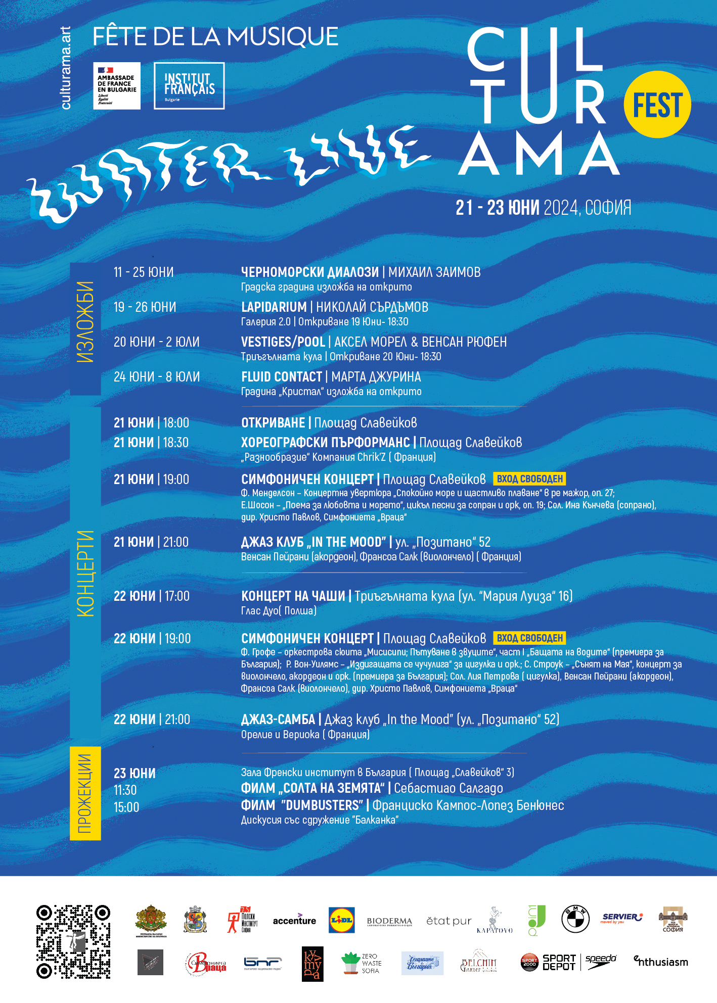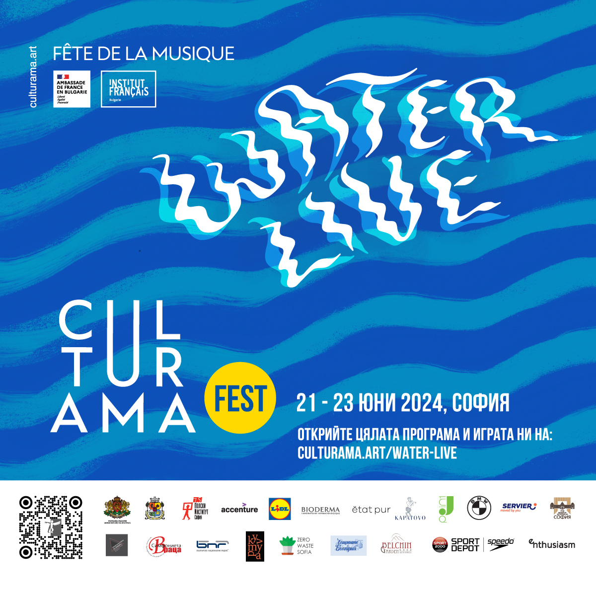 Шестото издание на фестивал CULTURAMA ще се проведе под мотото: Water Live – музиката на водата. Програмата на фестивала включва пет мащабни изложби на напълно различни като стил и визуална идентичност автори, обединени от широката тема на водата. Ще се насладим на концерти на открито, музикални и танцови пърформанси от преливащи един в друг жанрове и стилове – класика, джаз, самба, хип-хоп, музика от стъкло, изпълнени от български, френски и полски изпълнители, изливащи се в един истински "Празник на музиката". Предизвикателството „Открий чешмите на София“ е специалната дигитална игра, вдъхновена от силата на водата и необходимостта да я опазваме. CULTURAMA отдава дължимото и на киното с прожекциите на филмите „Солта на земята“ на Себастио Салгадо и Вим Вендерс, и филма Dambusters – Тhe start of the riverlution на режисьора Francisco Campos-Lopez Benyunes. Ще видим изложби на Михаил Заимов (България), Николай Сърдъмов (България), Венсан Рюфeн (Франция), Аксел Морел (Франция), Марта Джурина (България).