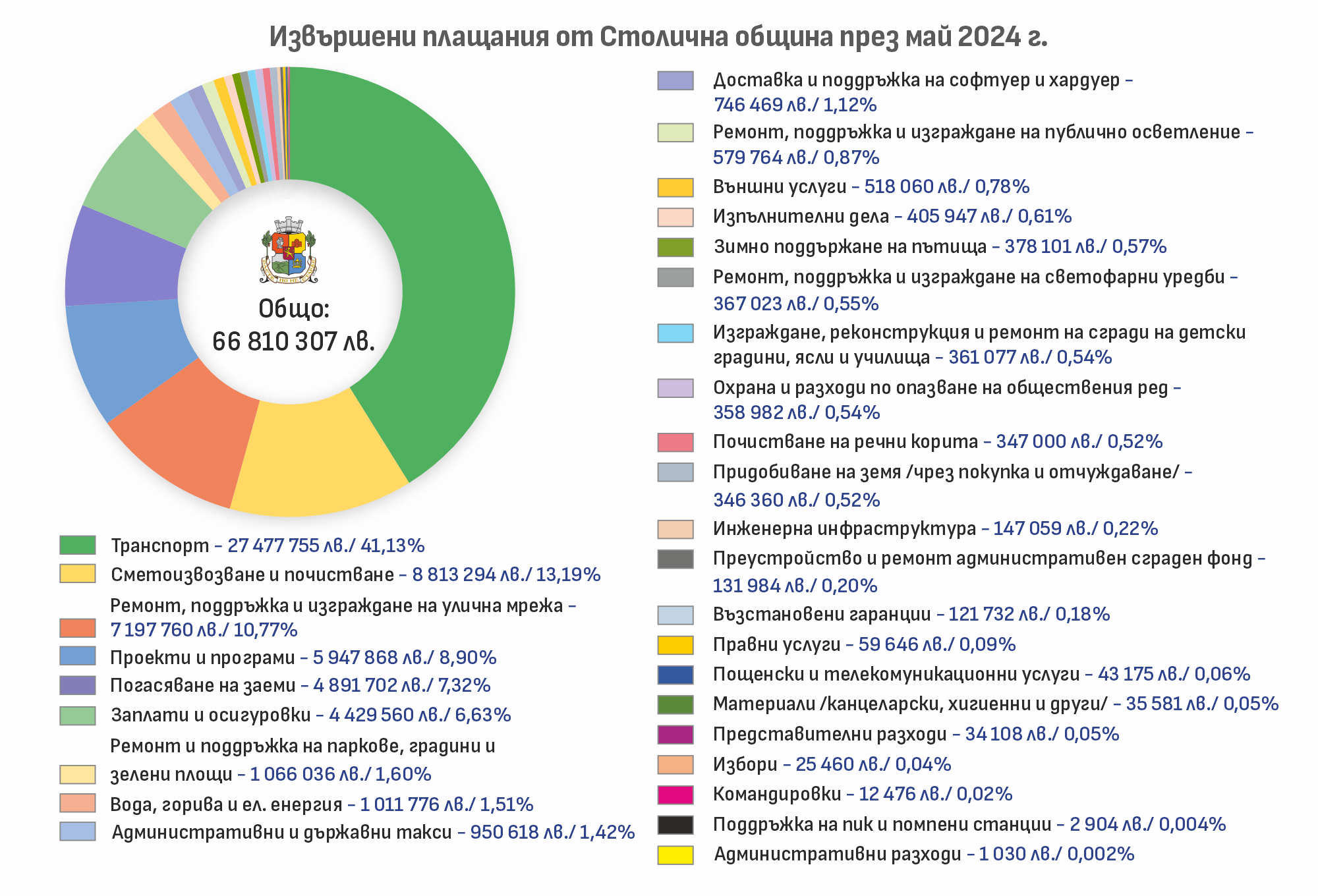 Столичната община публикува информация за всички разплащания, които е направила през май 2024 г. Столичната община е извършила плащания през май 2024 г. в размер на 66.8 млн. лв. и е заредила лимити за финансиране на разплащания на разходи на районните администрации 105.5 млн. лв. и към второстепенни и третостепенни разпоредители на средства – 25,9 млн. лв. Детайли за разплащанията на общината и заредените лимити в машинно четим формат можете да намерите ТУК.