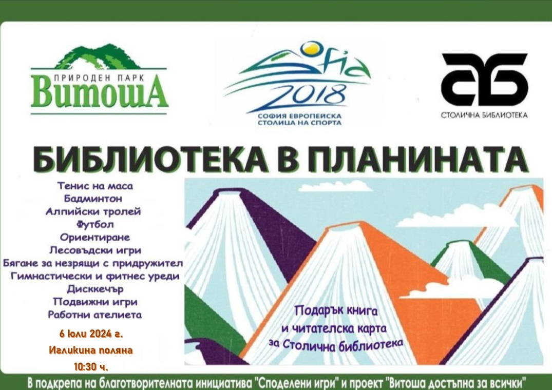 За девета поредна година Столична библиотека чрез инициативата си „Библиотека в планината“ подкрепя благотворителното събитие „Споделени игри“, което се организира от Фондация „София – европейска столица на спорта“, Национална спортна академия „Васил Левски“ и Дирекция на Природен парк „Витоша“, мотивиращо към толерантност и ангажираност към хората със специални нужди и техните проблеми. В „Споделени игри 2024“ са подготвени 13 сета за различни дисциплини, в които хора със специални нужди ще получават напътствия и възможност да спортуват, подпомагани от свои връстници.