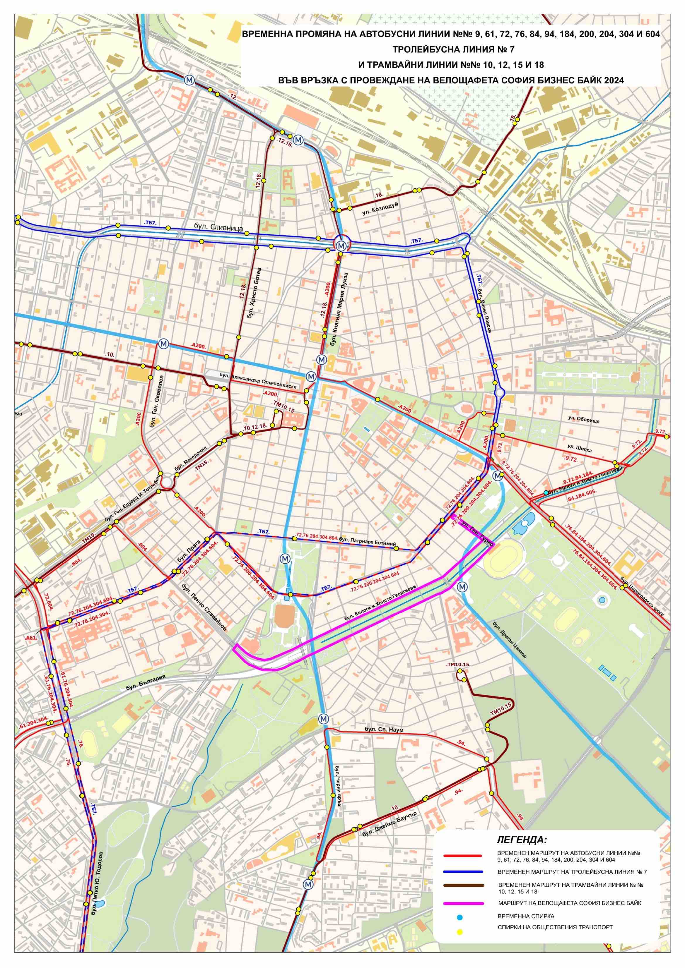 Автобусна линия № 76 (в посока ж.к. „Гоце Делчев”): от бул. „Цариградско шосе” по бул. „Цар Освободител”, по бул. „Васил Левски”, бул. „Патриарх Евтимий“ (връщане по бул. „Ген. Скобелев” и транспортен тунел НДК), по бул. „Прага”, ул. „Св. Георги Софийски”, по бул. „Акад. Ив. Е. Гешов”, бул. „П. Ю. Тодоров” и по маршрута си, двупосочно; Автобусите ще спират на всички съществуващи автобусни и тролейбусни спирки в променения участък на маршрута и на спирка с код 1288 „Пл. Орлов мост“ на бул. „Цариградско шосе“ преди бул. „Евлоги и Христо Георгиеви” в посока ж.к. „Гоце Делчев”, за автобусна линия № 280 и тролейбусни линии №№ 3, 4, 5 и 11.