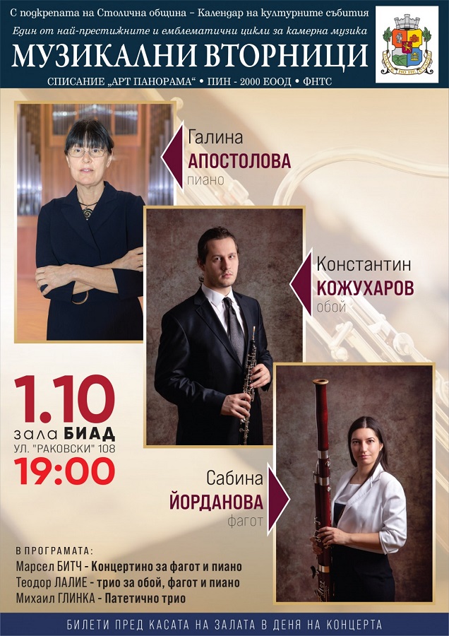 На 1 октомври в концертна зала БИАД от 19:00 ч. ще се проведе концерт с рядко изпълнявани произведения на триото Галина Апостолова (пиано), Константин Кожухаров (обой) и Сабина Йорданова (фагот).