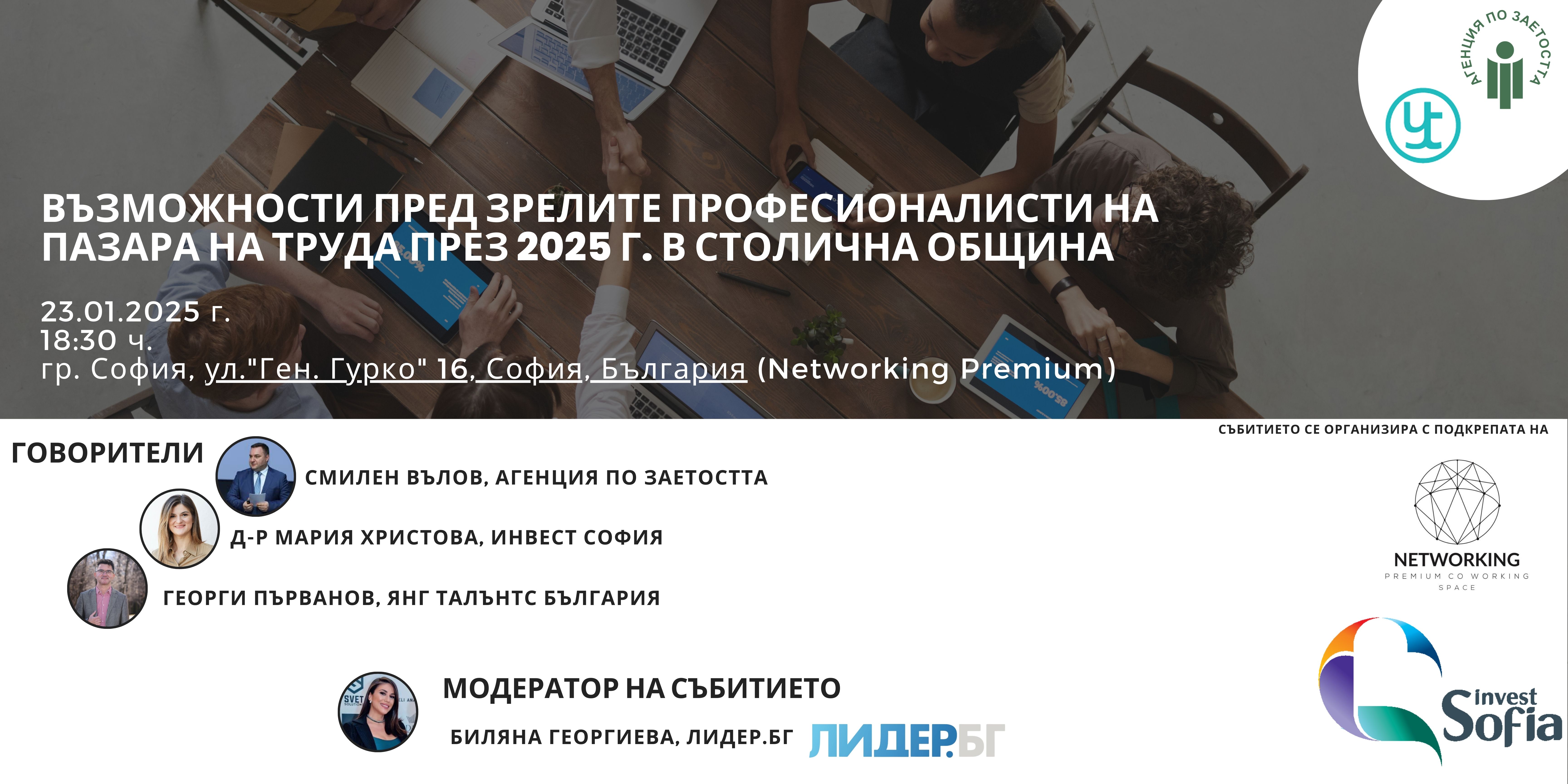 На 23 януари, четвъртък, от 18:30 часа, в "Премиум Нетуъркинг", ул. "Ген. Гурко" 16, София Инвест Sofia IS и платформата Янг Талънтс България организират първата в столицата и в национален мащаб дискусия на тема: "Възможности пред зрелите професионалисти в Столична община през 2025 г.".