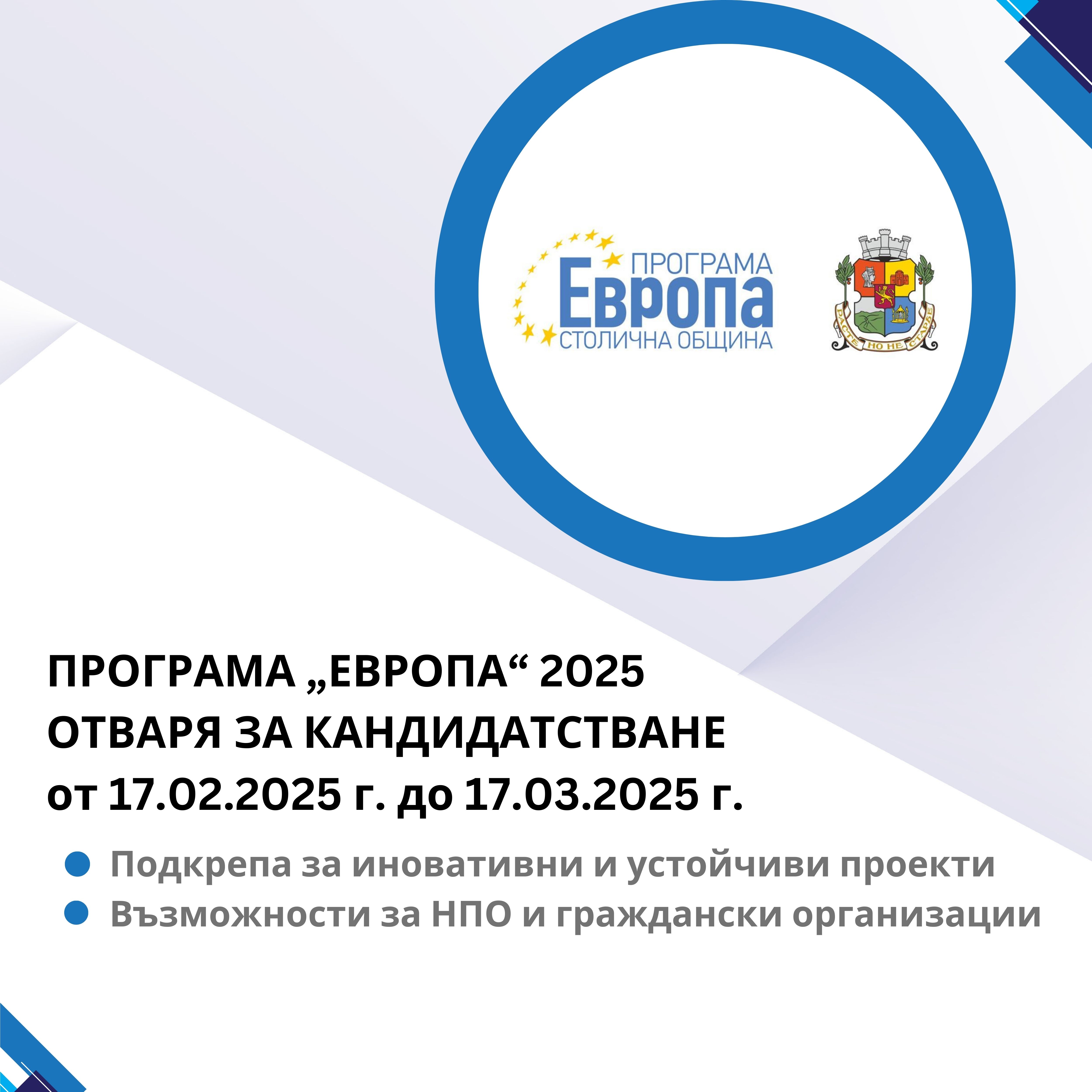 Кандидатстването ще се осъществи в периода от 17.02.2025 г. до 17.03.2025 г. Проектните предложения се подават само и единствено по електронен път на интернет страницата на Програма „Европа” www.evropa-so.bg.