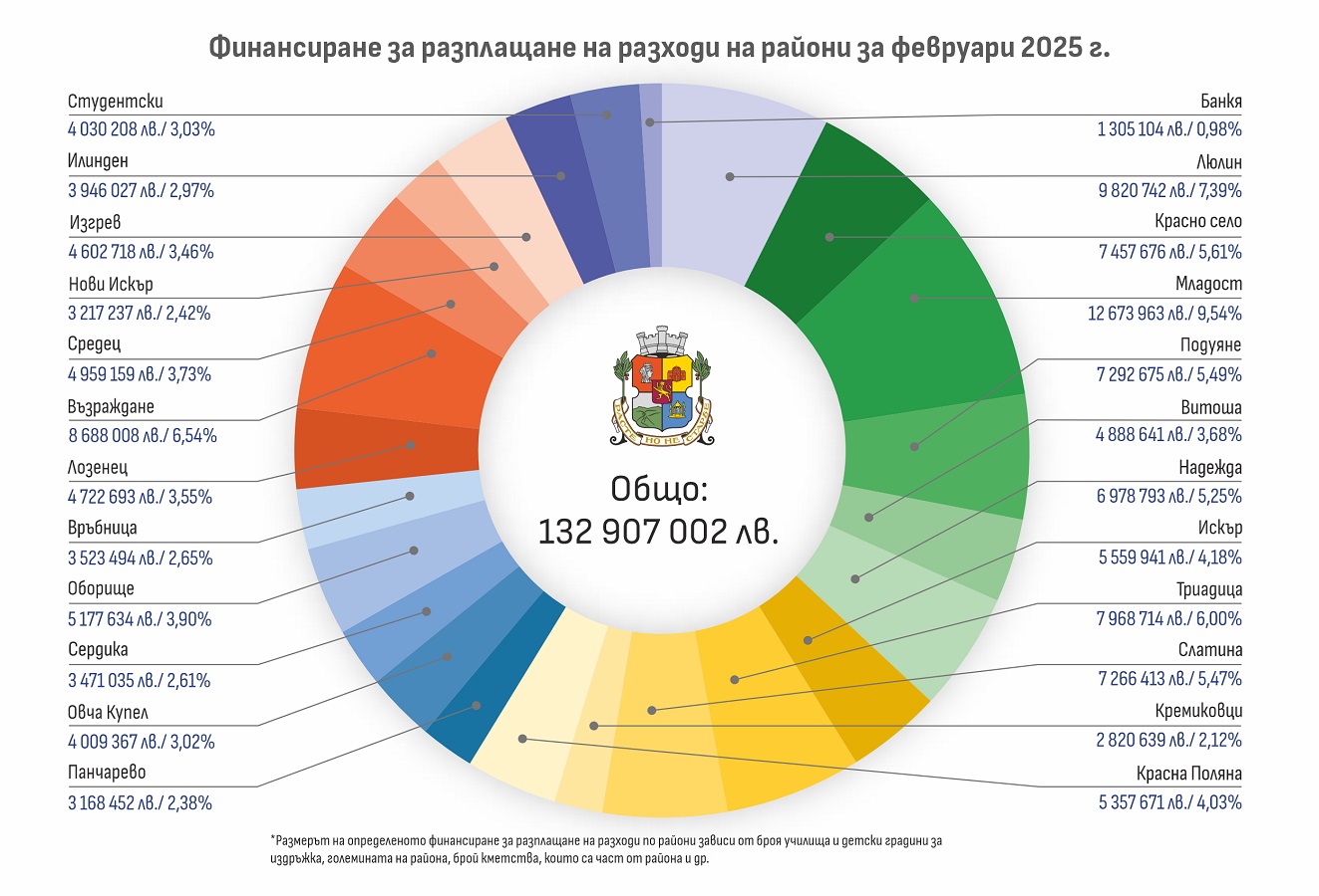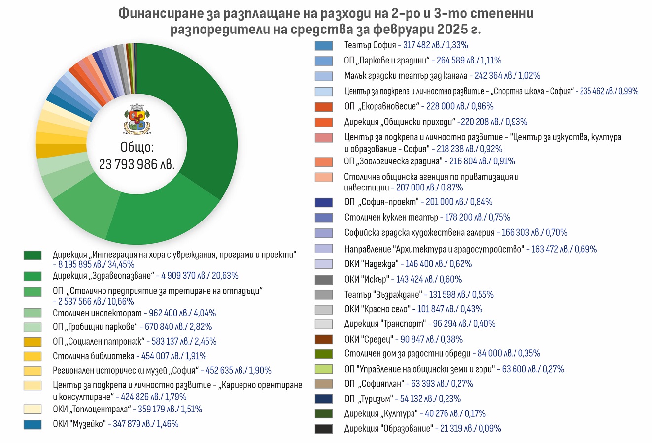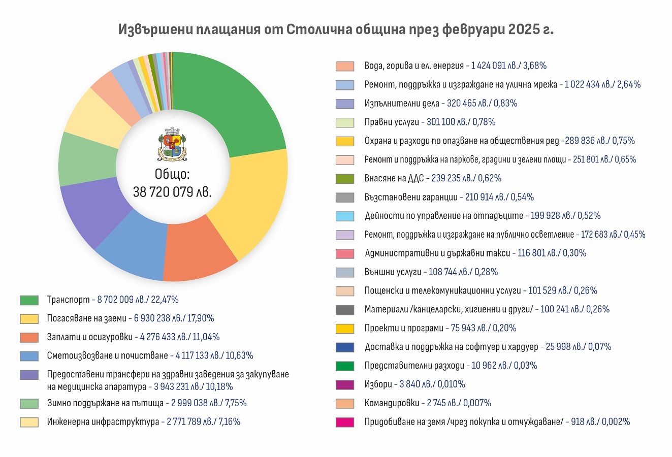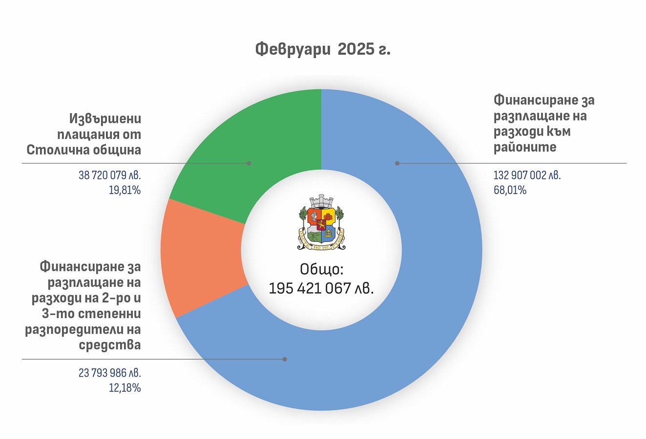 Общо разплатени от Столичната община през февруари са – 195 421 067 лв. От тях извършените плащания директно от Столична община са в размер на 38 720 079 лв., което е 19,8% от общите разплащания за месеца.