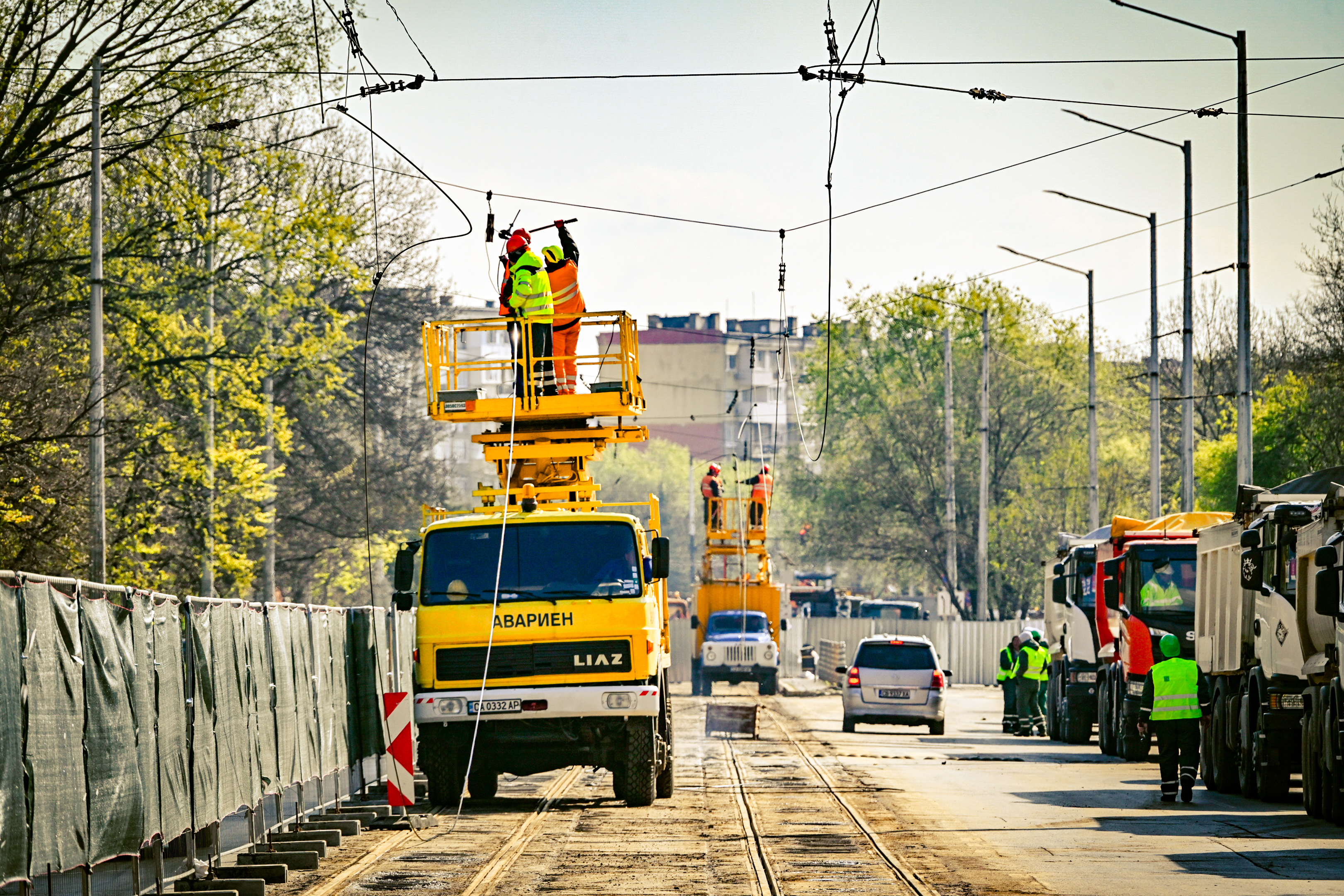 Проектът включва цялостно обновяване на пътните платна, трамвайните релси, тротоарите и осветлението