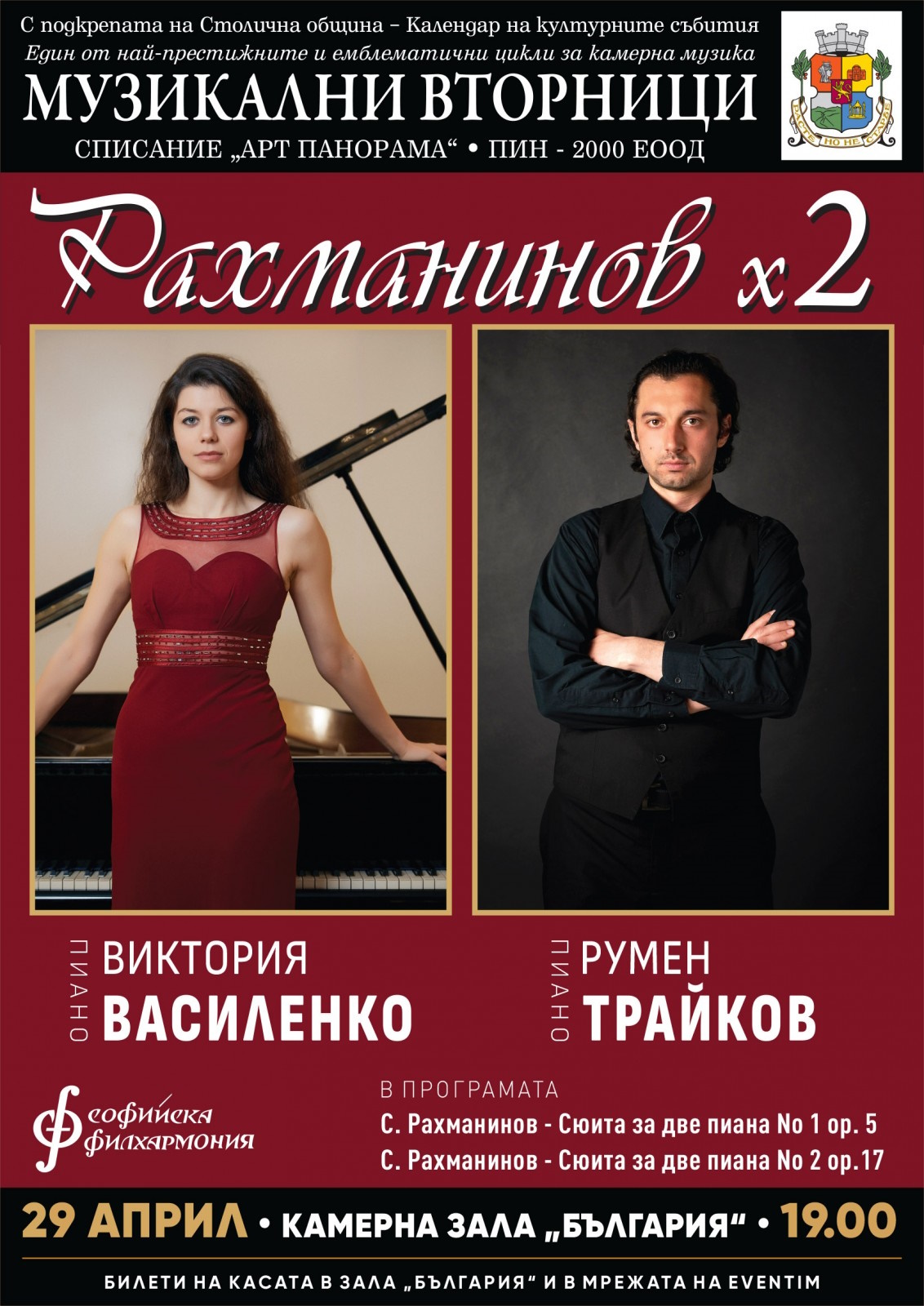 На 29 април от 19:00 ч. в Камерна зала "България" цикълът "Музикални вторници" представя концерт "Рахманинов х 2" на Виктория Василенко (пиано) и Румен Трайков (пиано).