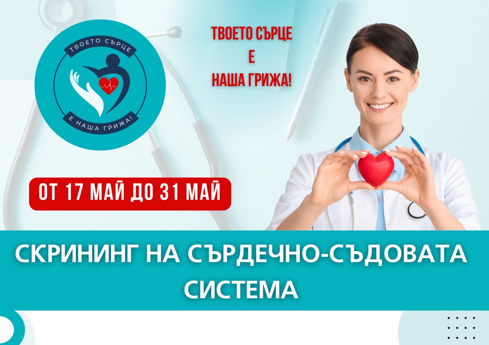 От 17 май – Световния ден за борба с хипертонията – до 31 май софиянци ще могат да си направят безплатен преглед на сърцето. Това е първият етап от Общинската скрининг програма за сърдечносъдовата система. Вторият етап на кампанията ще се проведе от 29 септември (Световен ден на сърцето) до 15 октомври т.г.