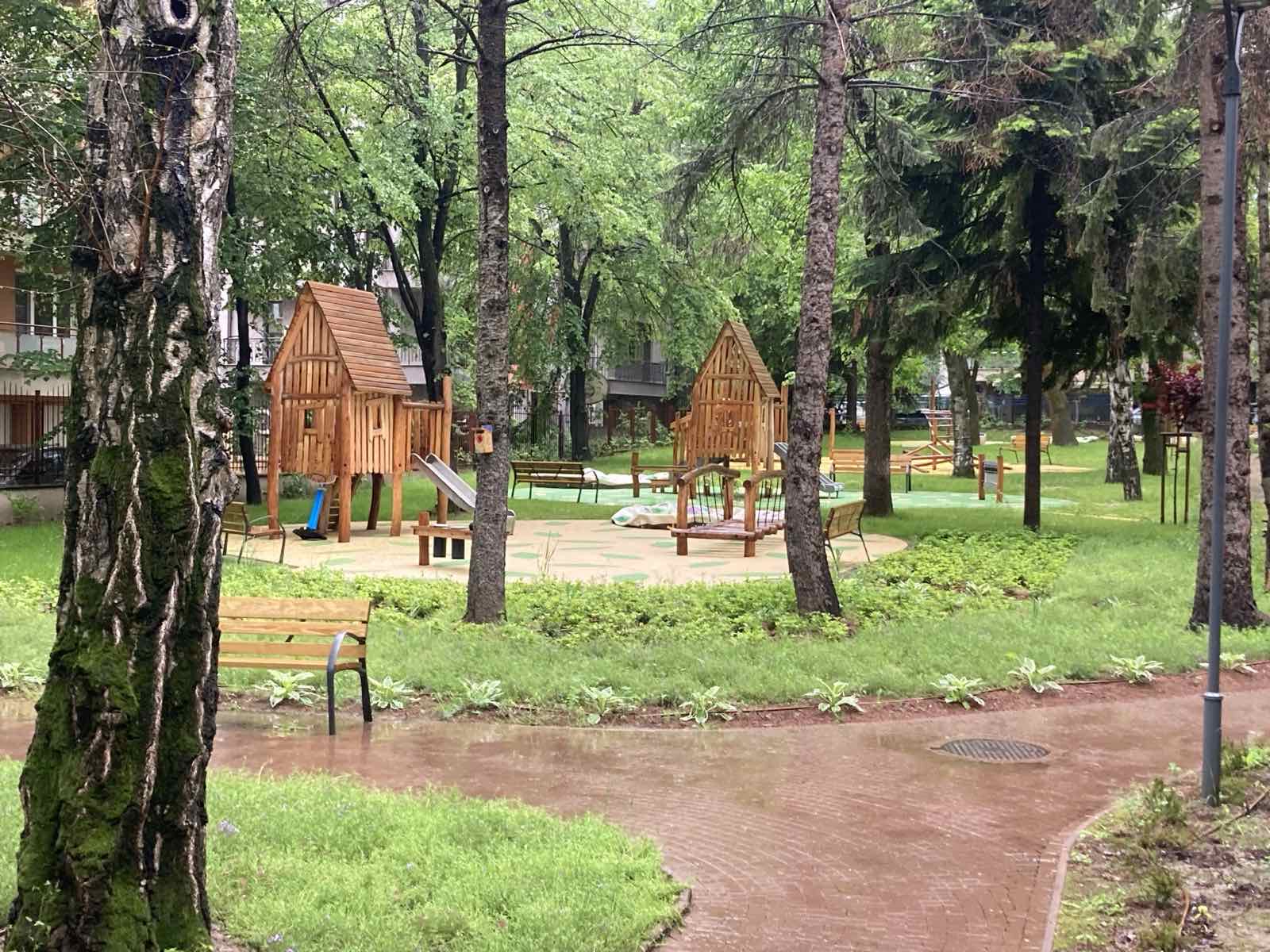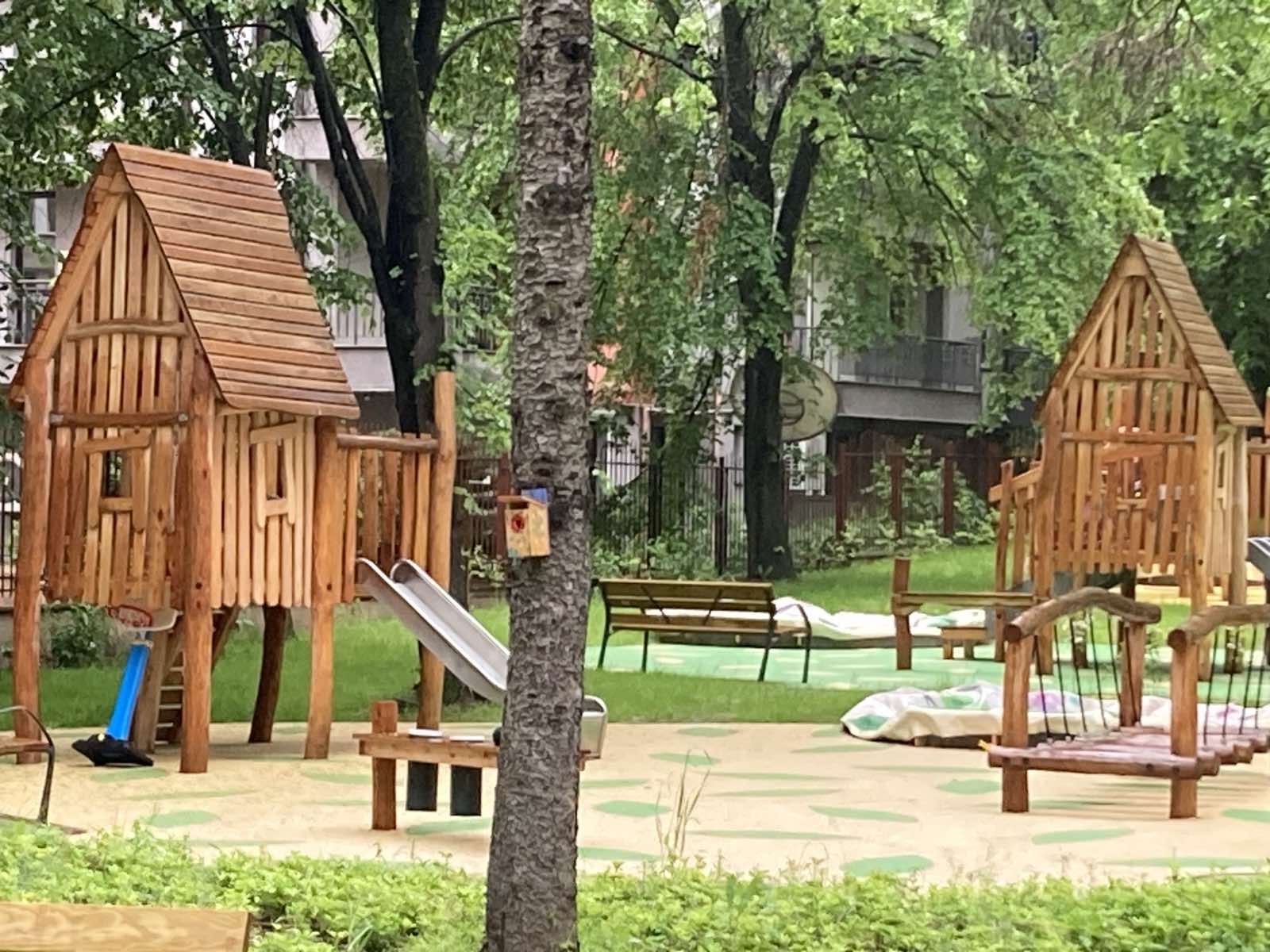 Извършено е и цялостно обновяване на детските площадки в двора. Специално място е отделено на дървени къщички за игра, които напомнят приказни сюжети и създават особен уют на пространството.