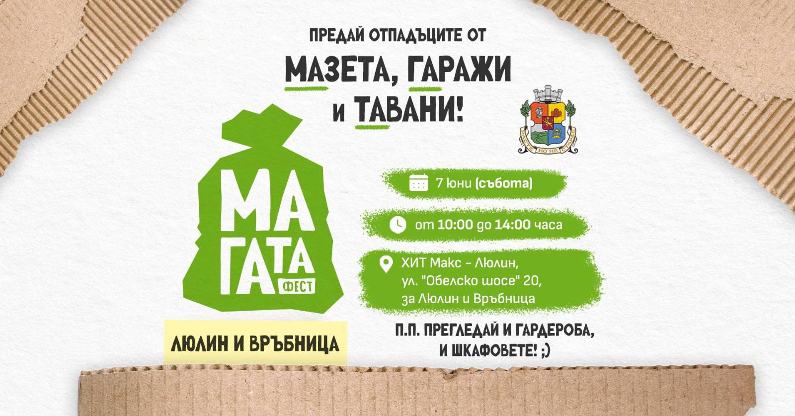 Столичната община продължава провеждането на МаГаТа Фест с четвъртото си издание. Тази събота познатият вече Фестивал на столичани ще бъде във "Люлин" и "Връбница". Събитието дава възможност на софиянци да предадат на едно място отпадъци от мазета, гаражи и тавани като по този начин спомага за подобряване на разделното събиране на различните видове отпадъци и тяхното последващо рециклиране.