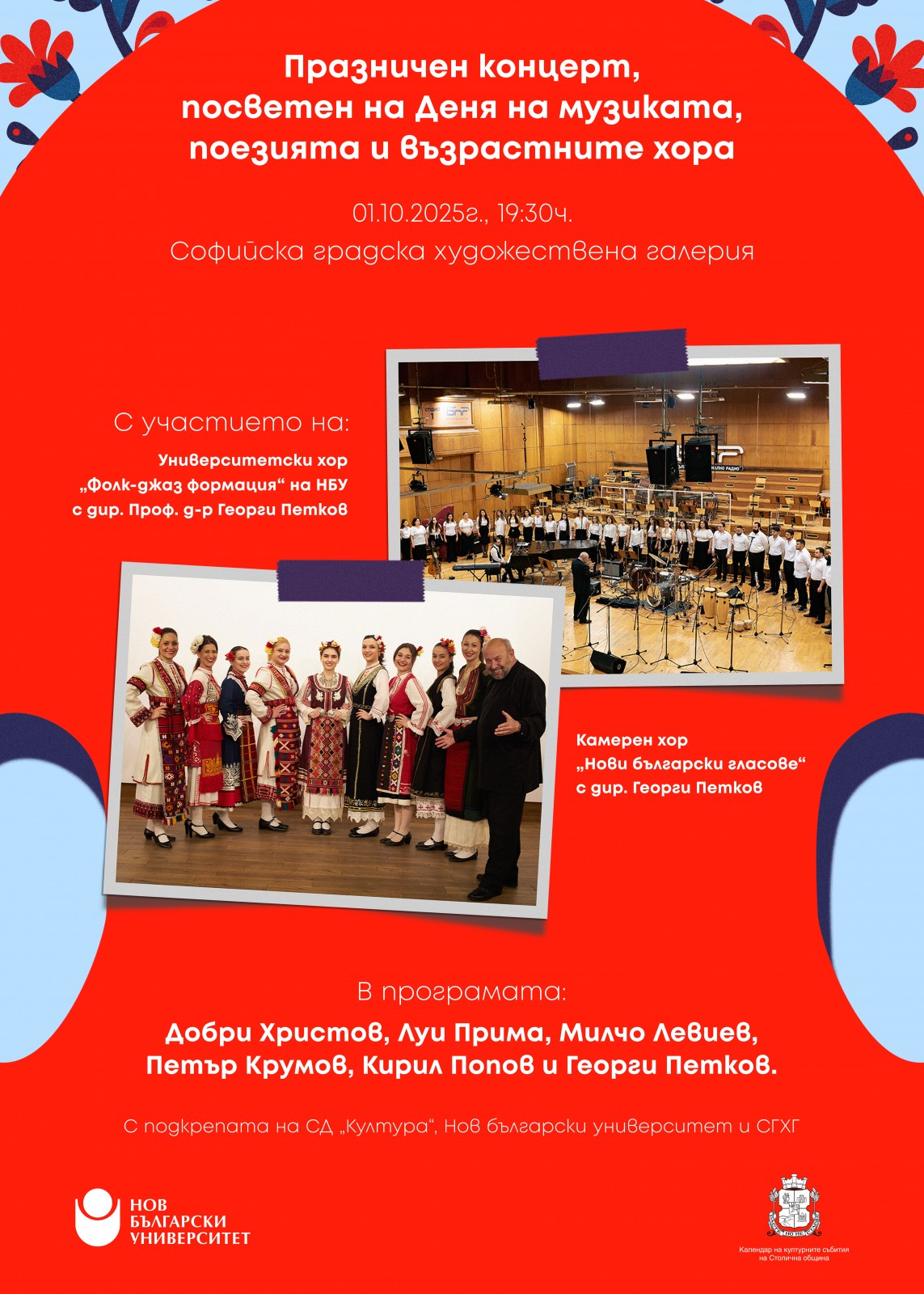 На 1 октомври от 19.30 ч. в Софийска градска художествена галерия ще се състои празничен концерт, посветен на Деня на музиката, поезията и възрастните хора. Публиката ще се наслади на изпълненията на два младежки хорови състава, създадени в Нов български университет от проф. д-р Георги Петков и под негово диригентство – Камерен хор "Нови български гласове" и Университетски хор "Фолк-джаз формация".