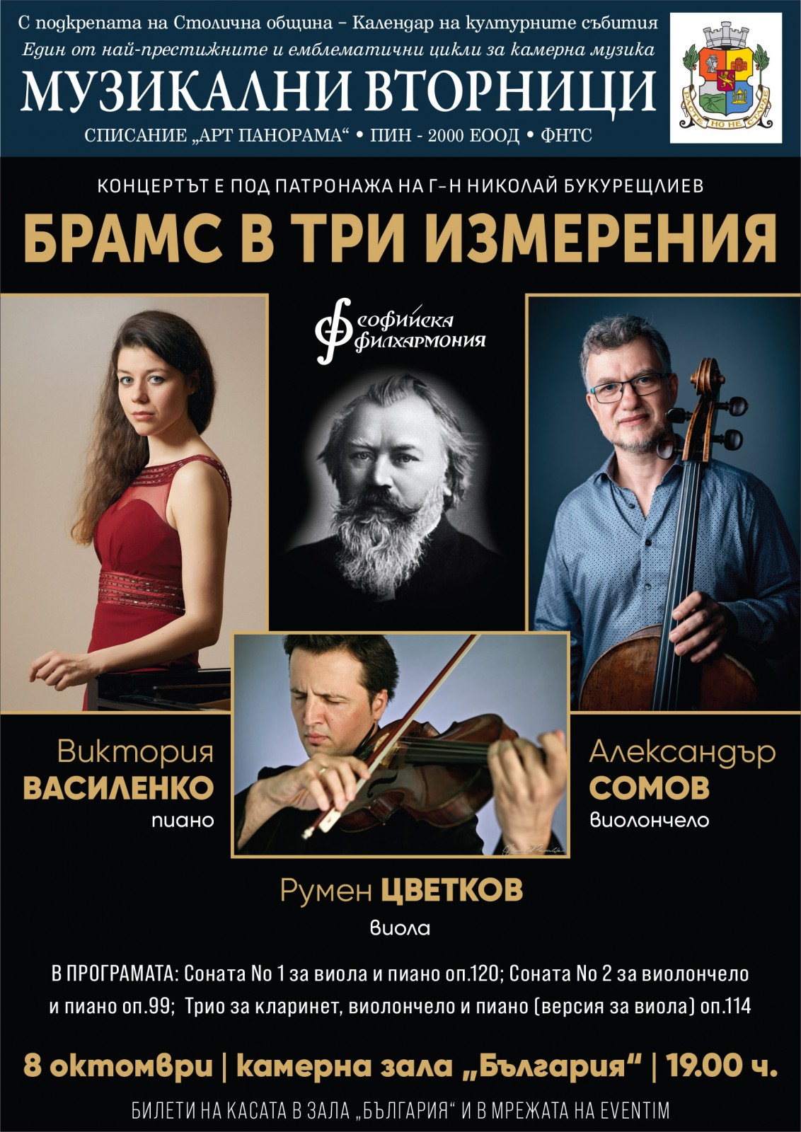 На 8 октомври от 19:00 ч. в зала "България" любителите на класическата музика ще имат удоволствието да чуят концерта "Брамс в три измерения" с три различни произведения от Йоханес Брамс, изпълнени от Виктория Василенко (пиано), Румен Цветков (виола) и Александър Сомов (виолончело).