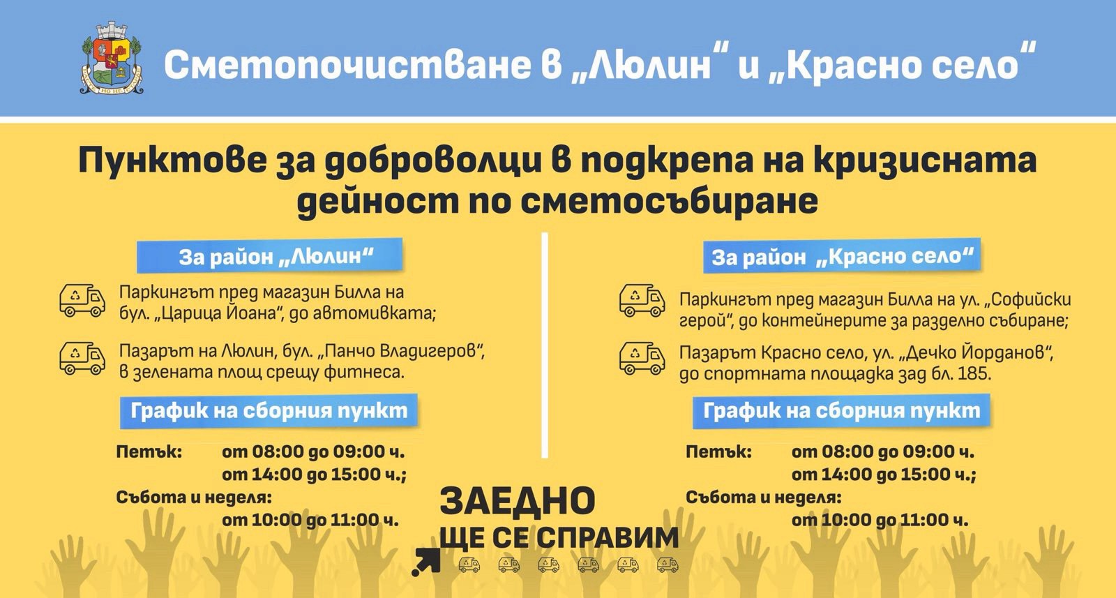Във връзка с проявения висок обществен интерес и множеството запитвания от граждани, изразили готовност да се включат в дейностите по сметосъбиране, Столичната община създава организация за участие на доброволци в текущата кризисна операция по почистване на районите „Люлин“ и „Красно село“.