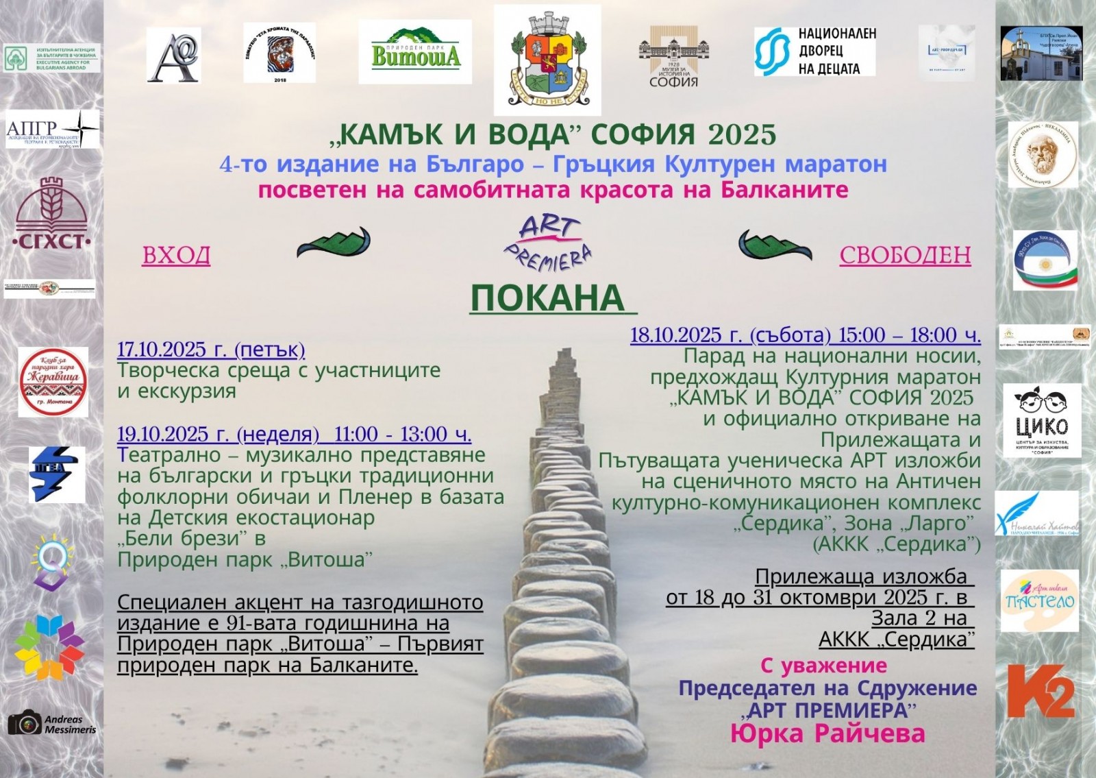От 17 до 19 октомври в Античен културно-комуникационен комплекс "Сердика" (под купола на "Ларгото") ще се проведе Българо-гръцки културен маратон "Камък и вода", реализиран от Сдружение "Арт Премиера". Събитието ще предложи колоритна сценична програма, предхождана от Парад на национални носии и официално откриване на изложби: