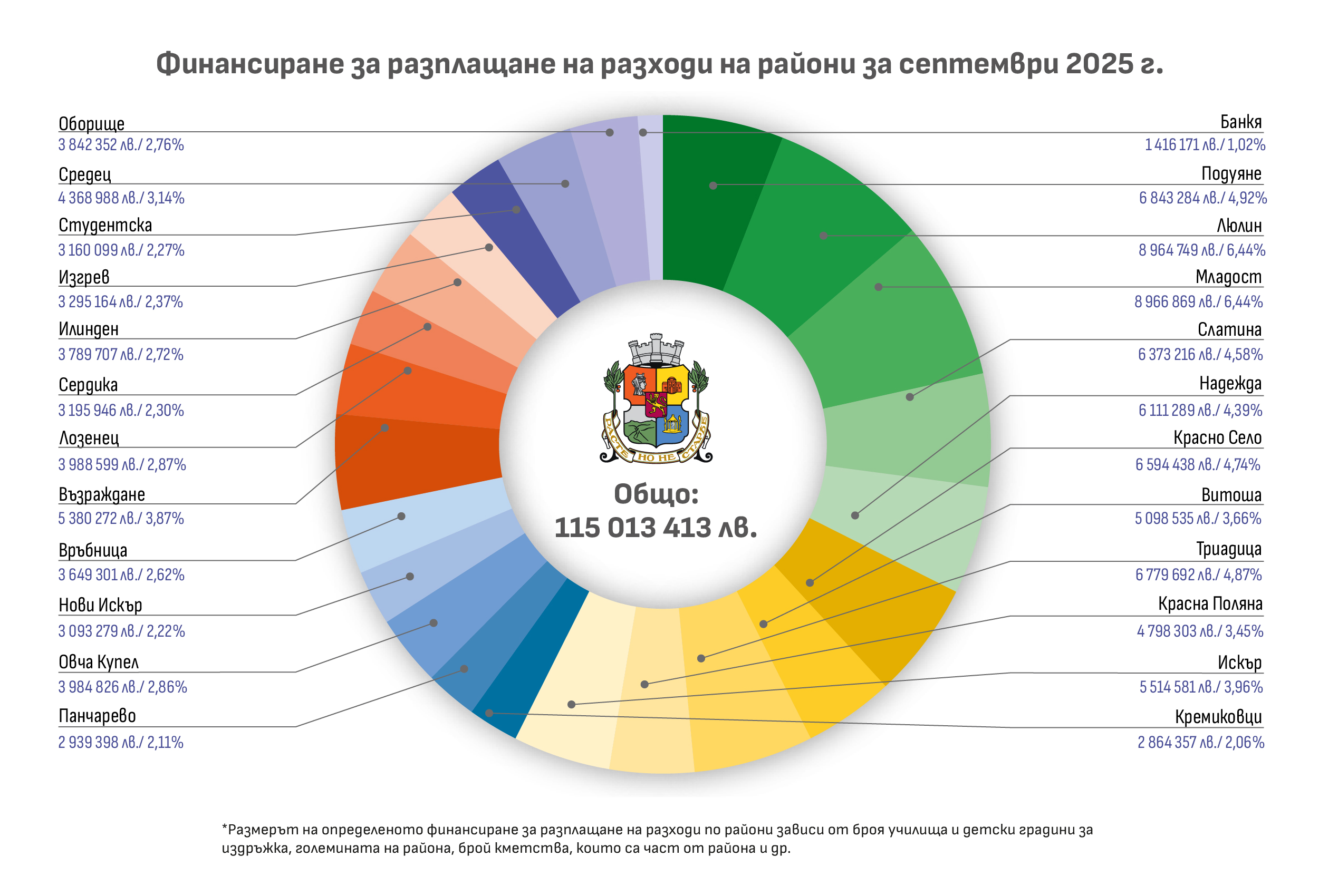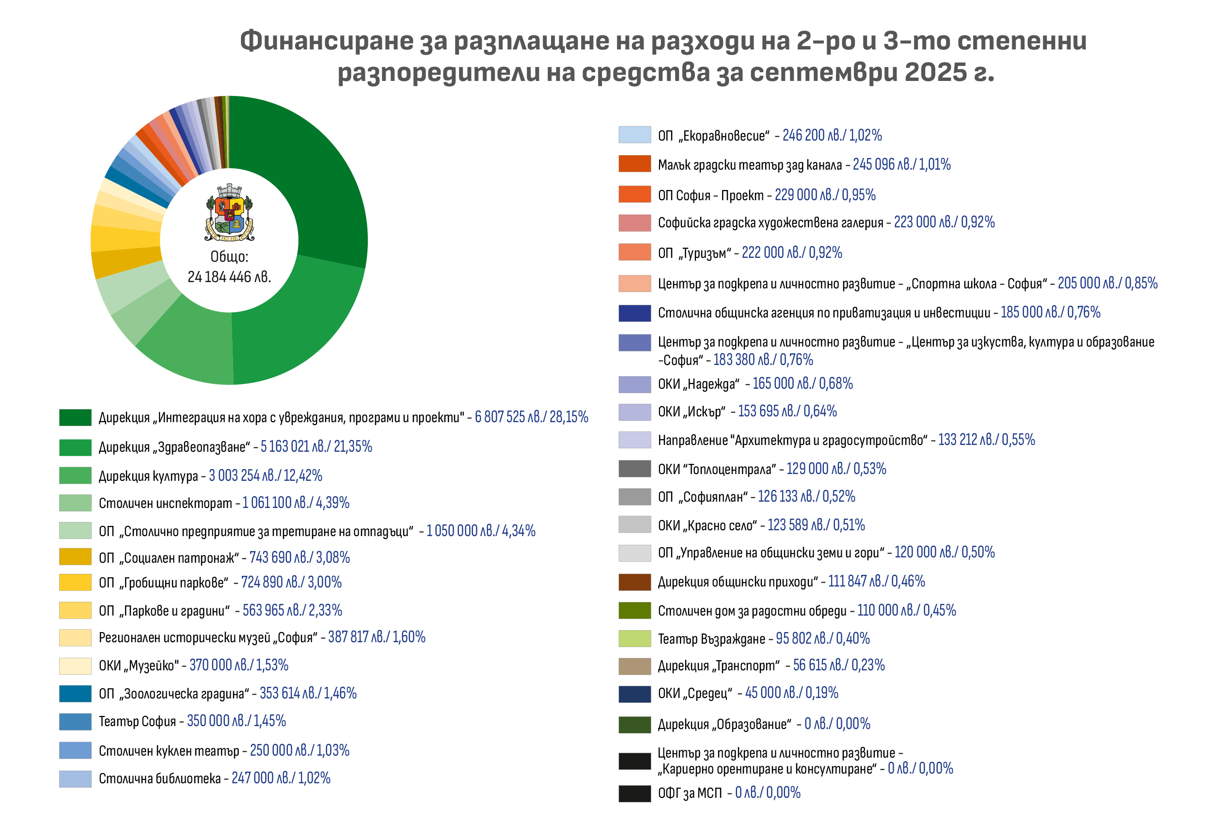 Общо разплатени от Столичната община средства през месец септември са – 238 697 354 лева. От тях извършените плащания директно от общината са в размер на 99.5 млн. лв., което е 41.68% от общите разплащания за месеца.