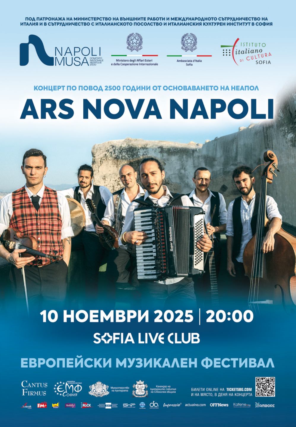На 10 ноември в Sofia Live Club от 20:00 ч. "Европейски музикален фестивал" представя концерт на една от най-известните и ценени музикални групи от сцената на новия неаполитански фолк – формацията Ars Nova Napoli. Събитието е по повод 2500 години от основаването на красивия и колоритен италиански град Неапол. Билети за концерта онлайн на Ticketsbg.com и на място преди началото на събитието.