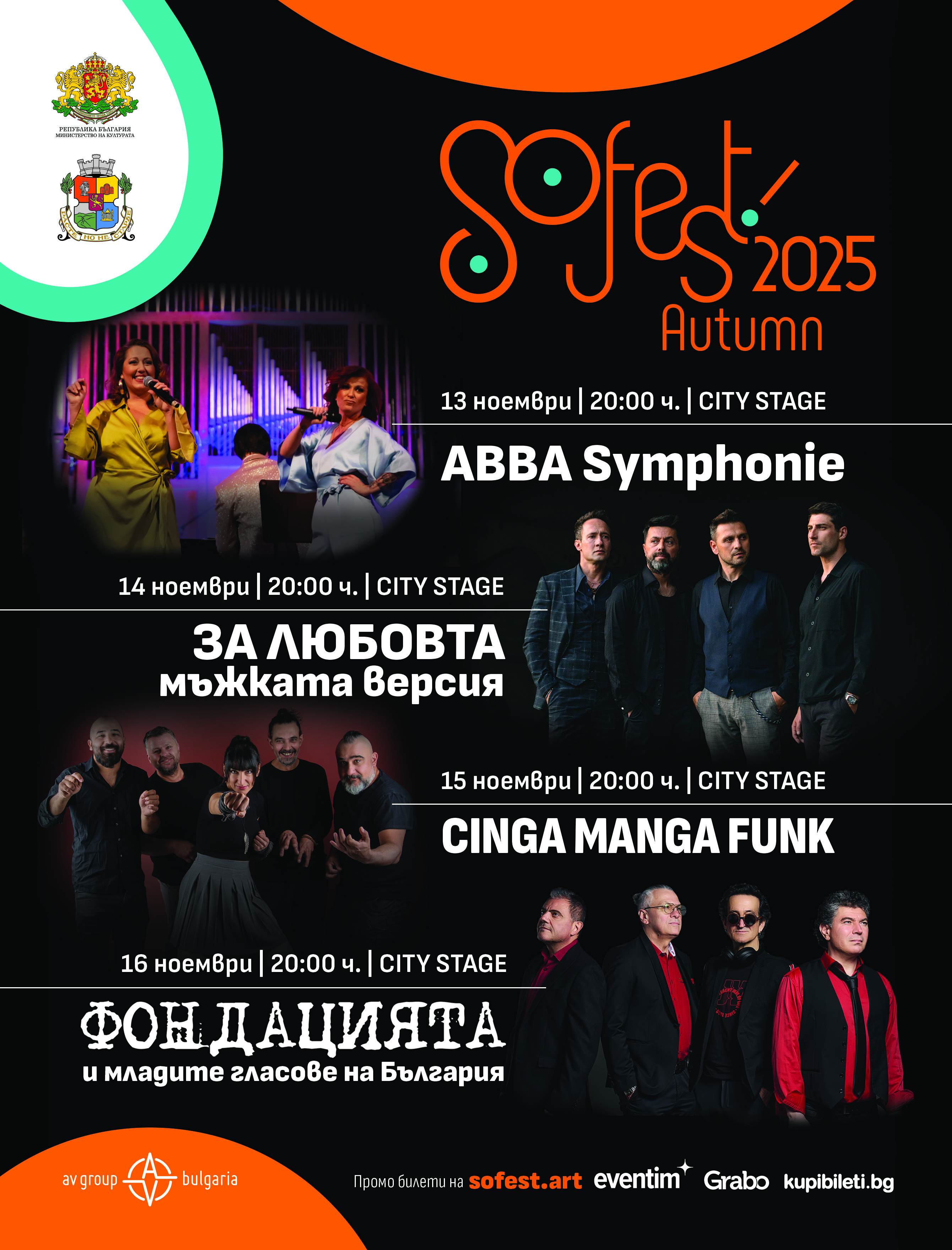 Есенното издание на SoFest стартира на 13 ноември от 20:00 ч. в City Stage с ABBA Symphonie, в който участват фантастичните Милица Гладнишка и Люси Дяковска. Проектът на Плевенска филхармония с диригент Георги Милтиядов ще бъде представен за първи път на клубна сцена. Шоуто е извън класическите форми и предлага нов прочит на симфоничния оркестър с поп гласове и гарантира едно незабравимо диско изживяване, с музиката на обичаната шведска четворка.