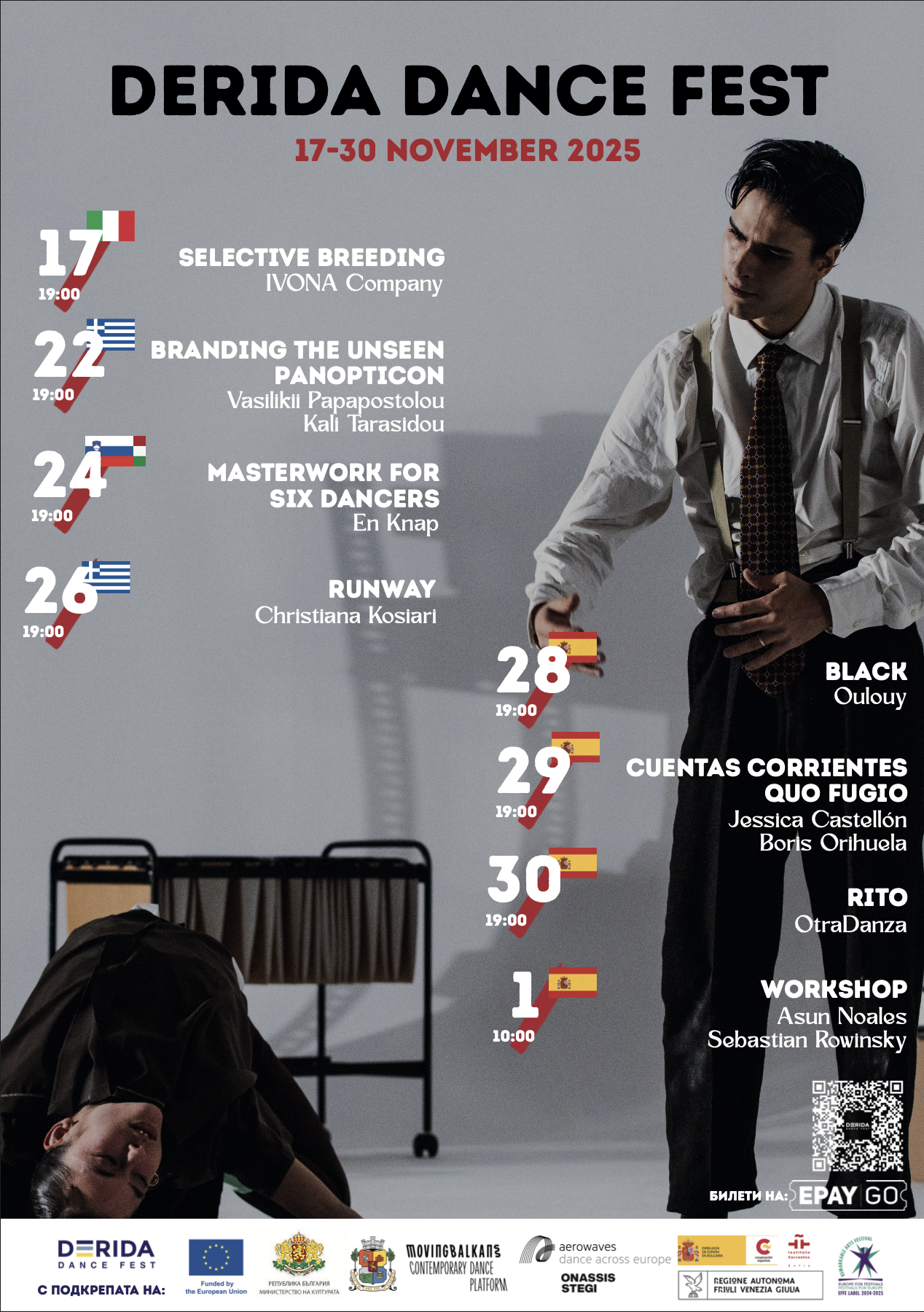 Тазгодишното издание на Derida Dance Fest поставя специален фокус върху испанската сцена, представяйки четири испански заглавия. Сред тях е спектакълът "Черно" на Oulouy, отличен сред най-добрите 20 представления от над 700 кандидатури на платформата Aerowaves. Фестивалът ще завърши с Rito – впечатляващо представление на хореографката Асун Ноалес, създател на OtraDanza и президент на AVED – Валенсианската асоциация на хореографите и танцовите компании.