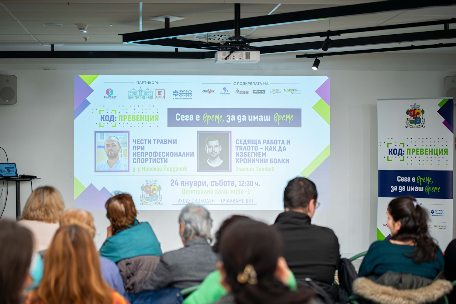На 24 януари на „Сцена Централни хали“, в първото събитие за 2026 г., кампанията за повишаване здравната култура “КОД: Превенция. Сега е време, за да имаш време“ стартира с участието на д-р Николай Йорданов – ортопед-травматолог, и Златин Петков – кинезитерапевт и персонален треньор. В рамките на срещата, експертите представиха информация за най-често срещаните травми при непрофесионалните спортисти и демонстрираха практически техники за намаляване на болката в областта на гърба и кръста.