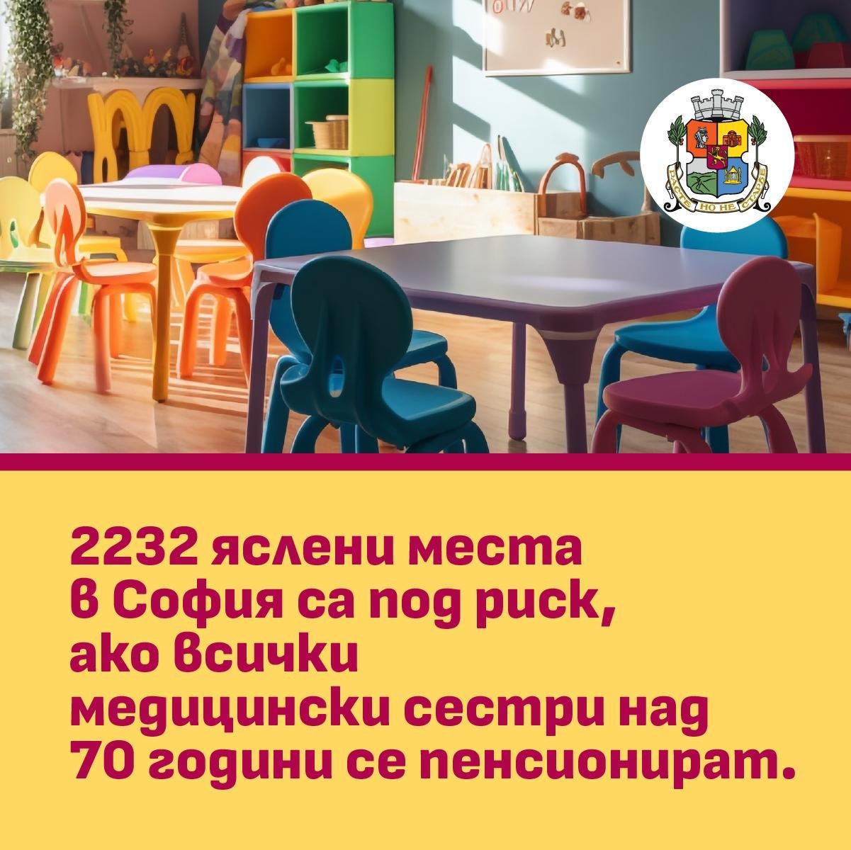 „2232 яслени места в София са под риск, ако медицинските сестри над 70 години се пенсионират. Причината е конкретна – по действащото законодателство всяка яслена група трябва задължително да има поне една медицинска сестра“, заяви кметът на София Васил Терзиев.