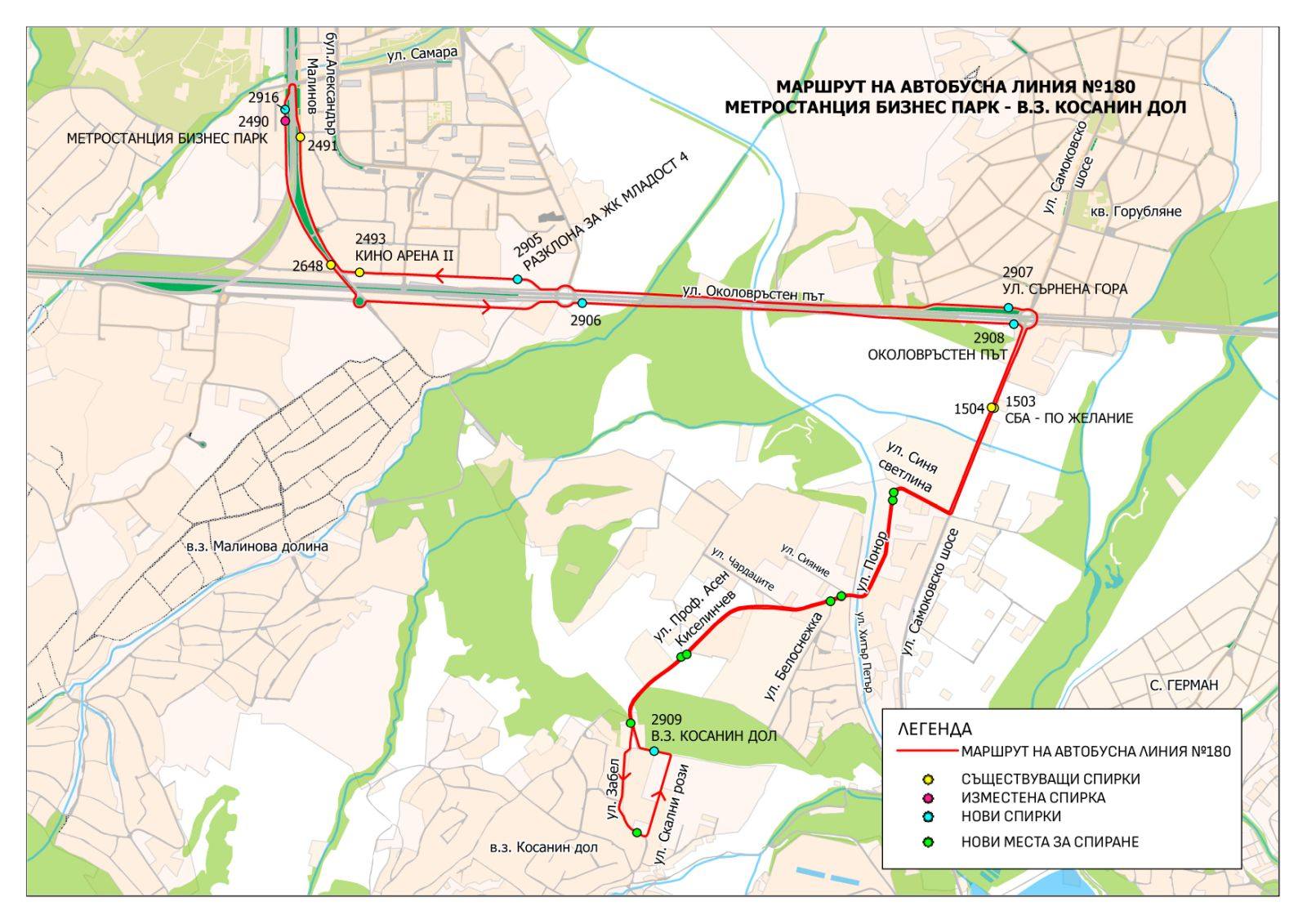 Маршрутът ще свързва метростанция „Бизнес парк“ с вилна зона Косанин дол, както следва: