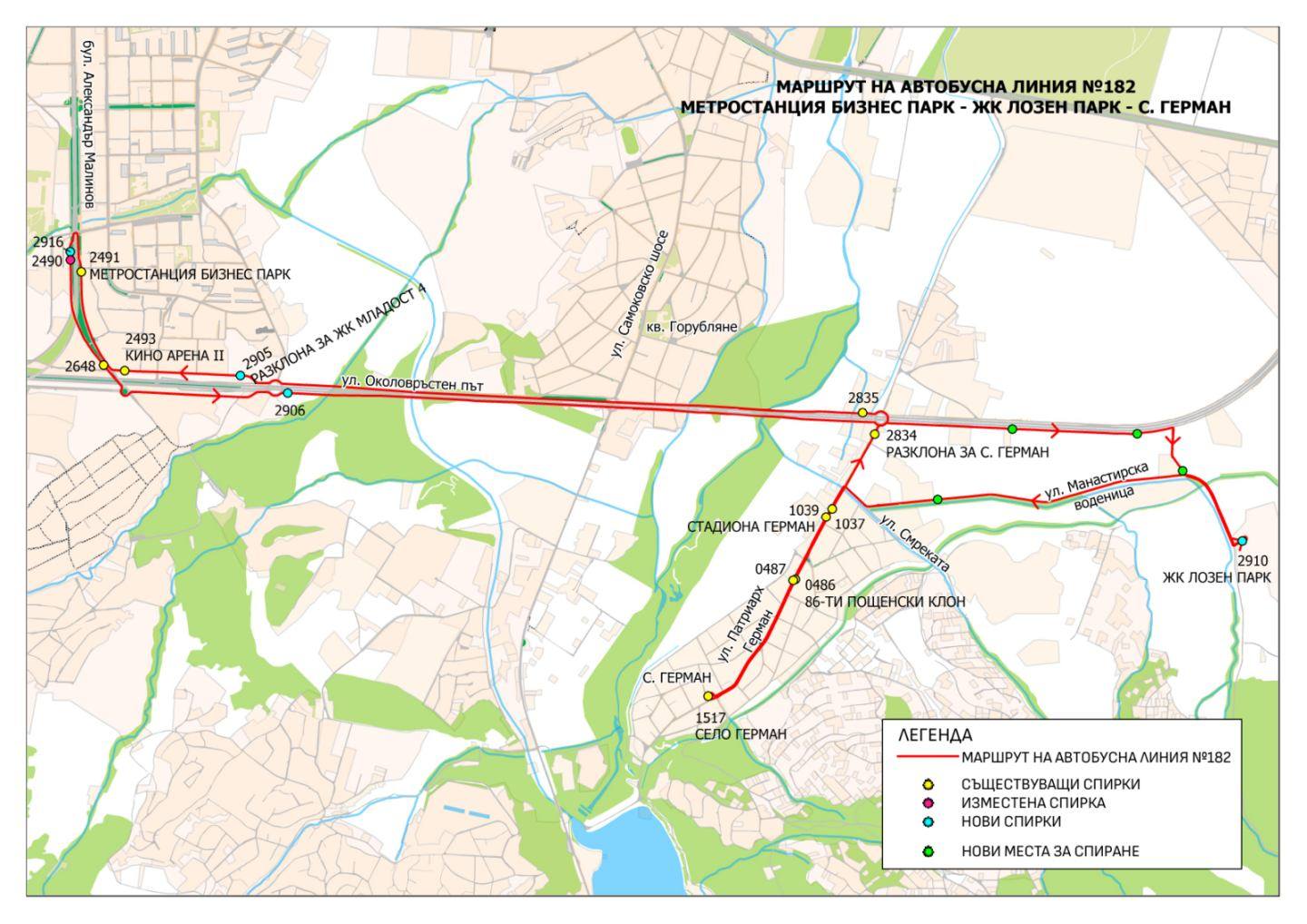 Маршрутът ще обслужва направлението метростанция „Бизнес парк“ – ж.к. „Лозен парк“ – с. Герман и обратно, преминавайки по: "Софийски околовръстен път" – ул. „Панорама Лозен“ – ул. „Манастирска воденица“ – ул. „Смреката“ – ул. „Патриарх Герман“.
