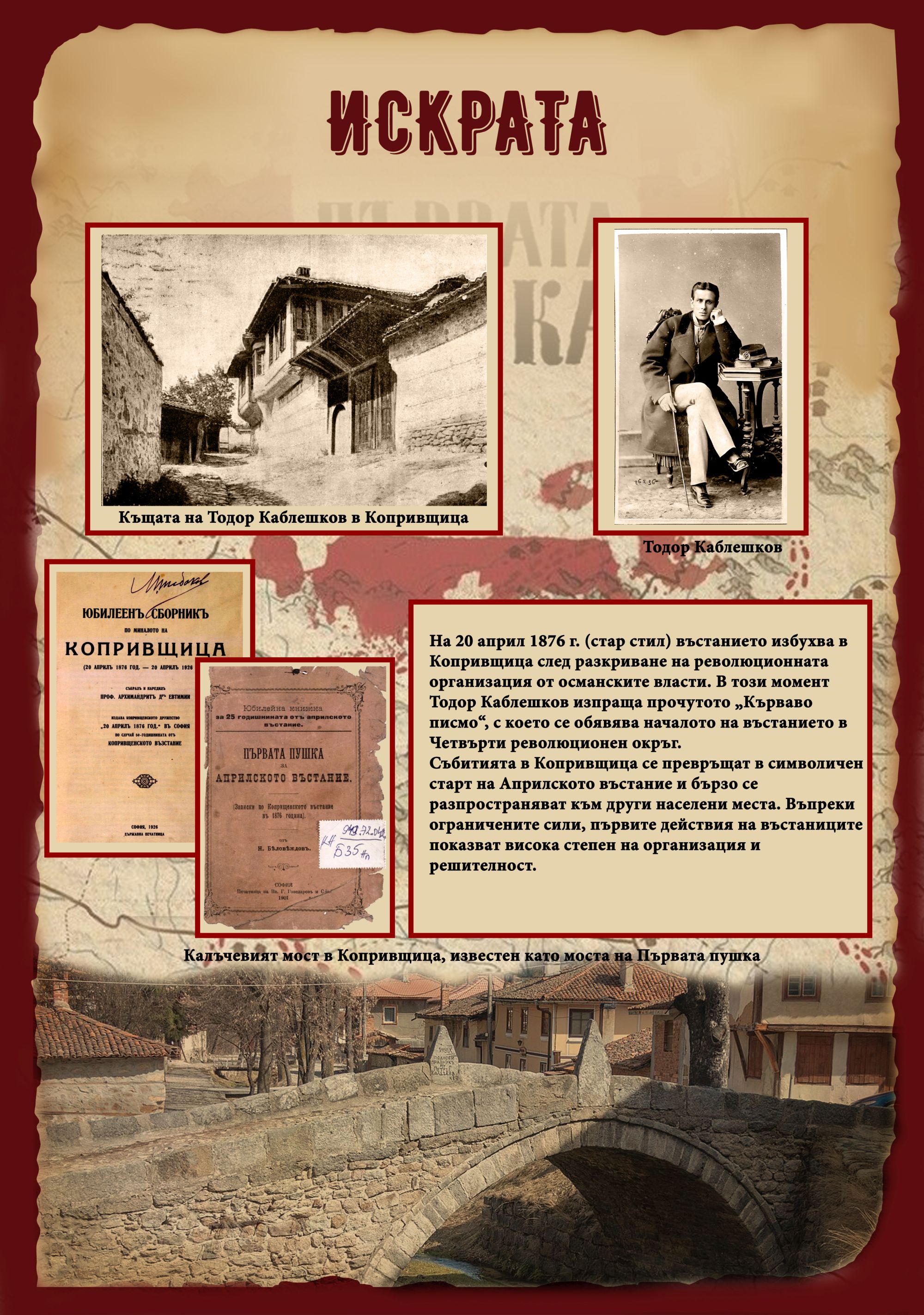 Националният литературен музей и къща музей „Иван Вазов“ допълват изложбата с редки автентични материали – портрети на водачите на въстанието, снимки, ръкопис на речта на Иван Вазов, посветена на 45-тата годишнина от Априлското въстание. Сред експонатите е и макетът на „Черешовото топче“, превърнало се в най-емблематичния „запазен знак“ на Априлското въстание. Особено място заемат изданията на над двадесет езика на романа „Под игото“, които свиделстват, как българската история и духовен код преминават далеч зад границите на страната и се превръщат в част от световното културно наследство.