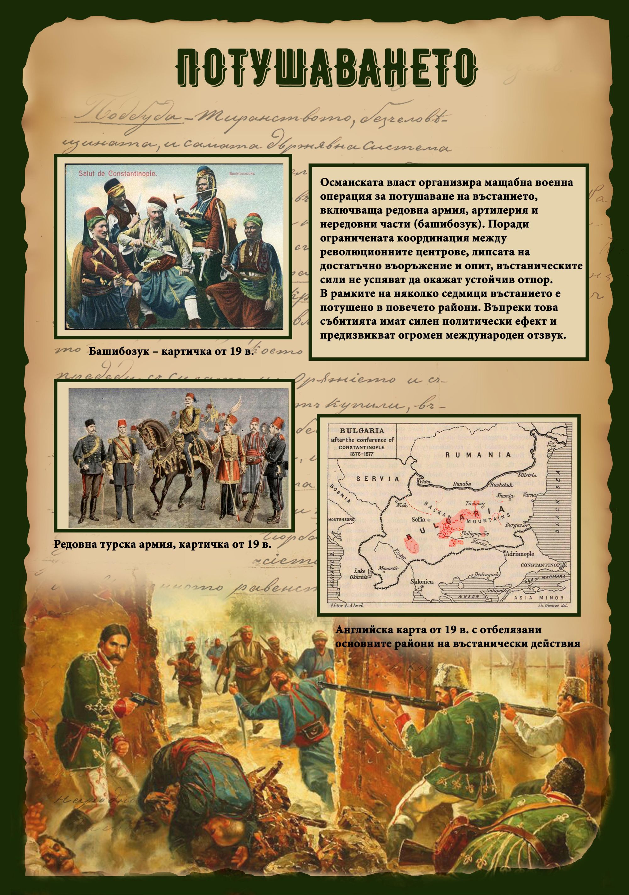 В експозицията са представени ценни албуми от фонд „Изкуство“ като „Летописци на Априлското въстание“, включващ рисунки на Христо Коев и Танчо Шабанов – самоуки художници – участници в събитията, оставили едни от най-ранните визуални свидетелства за въстанието; „Знаменосецът“ на Панайот Дражев; илюстрации на историческите композиции на Димитър Гюдженов, Калина Тасева и Златю Бояджиев, които придават на събитията силно емоционално измерение.