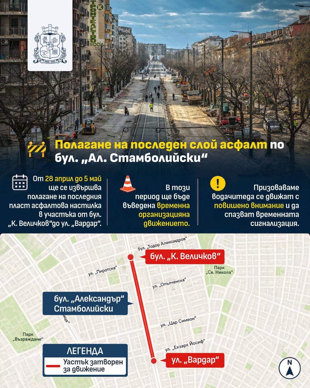 От 28 април започва полагането на последния пласт асфалтова настилка в участъка на бул. “Александър Стамболийски“ от бул. “Константин Величков“ до бул. “Вардар“. Въведена е временна организация на движението на столичния булевард, като се забранява преминаването на автомобили. Не се променя маршрутът на трамваите по линия № 8.