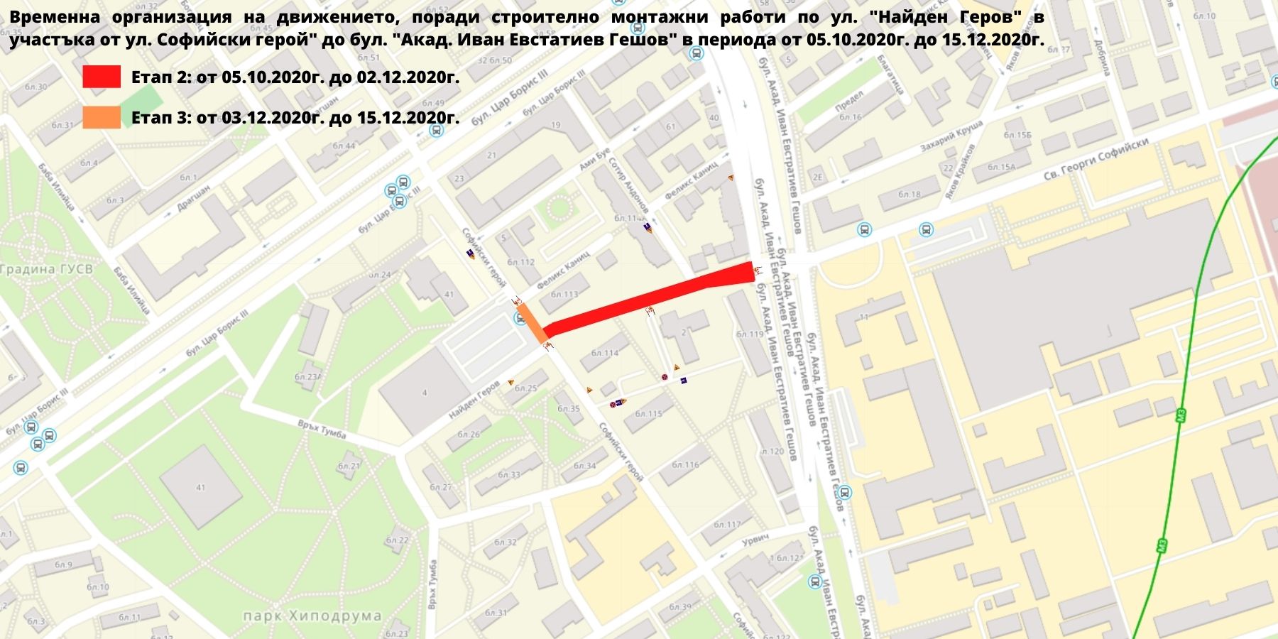 • от 05.10.2020 г. до 23.11.2020 г. по ул. „Найден Геров“ в участъка от бул. „Акад. Ив. Ев. Гешов“ до ул. „Софийски герой“;