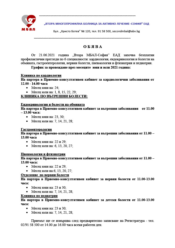 Във Втора МБАЛ – София от понеделник започват безплатни профилактични прегледи по 6 специалности, съобщиха от ръководството на Многопрофилната болница.