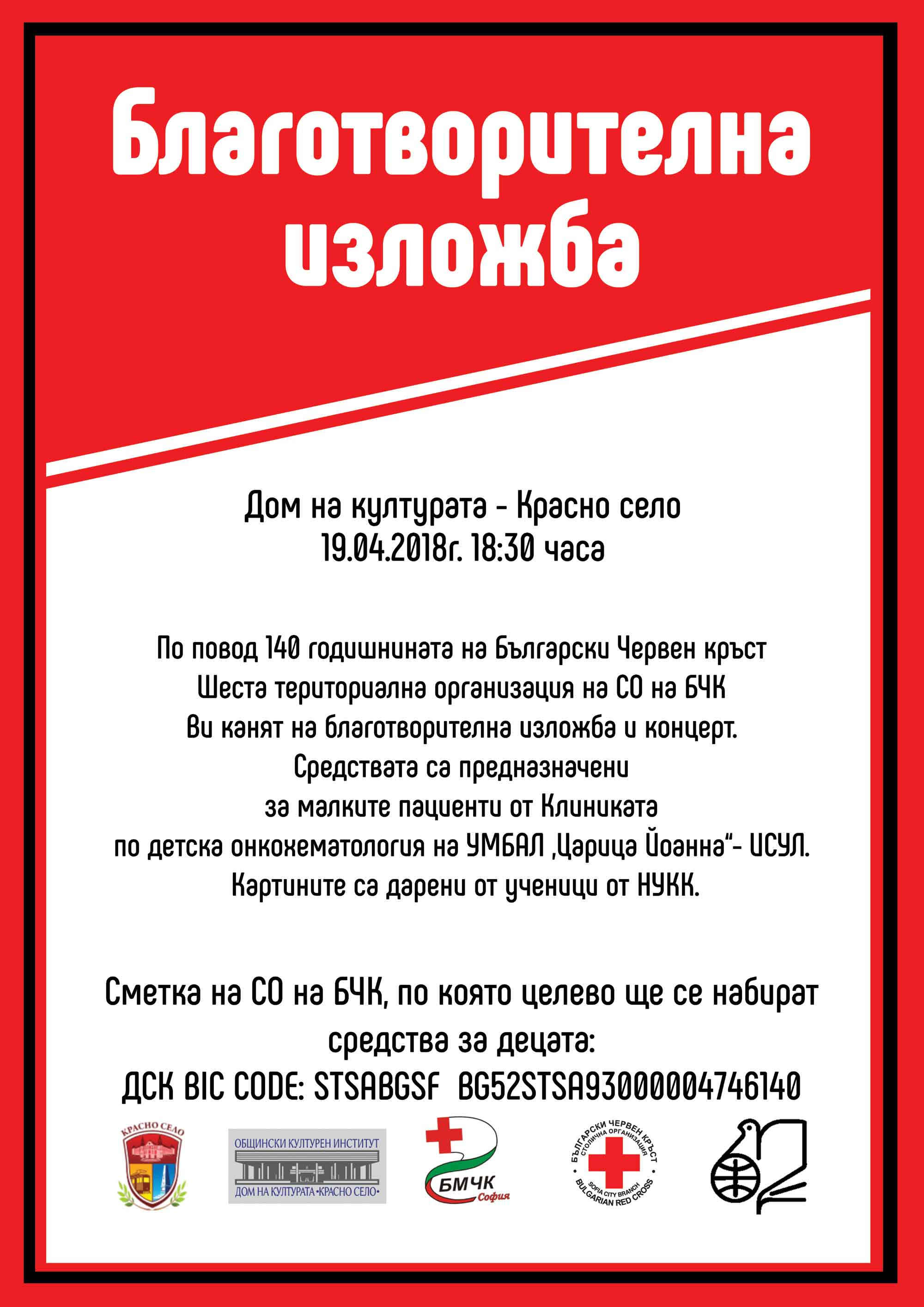 По повод 140-годишнината на Българския Червен кръст Шеста териториална организация на СО на БЧК ви канят на благотворителна изложба и концерт на 19.04.2018 г. от 18:30 ч. в Културен дом "Красно село".