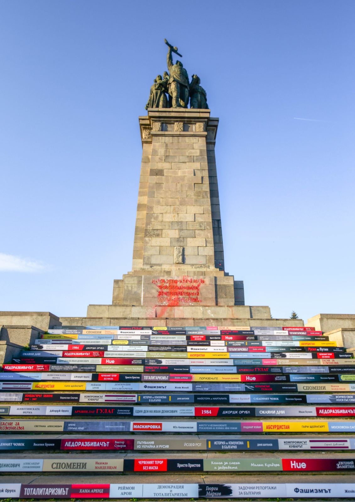 На стълбите пред монумента ще бъде разположена инсталация с кориците на емблематични книги, сред авторите, на които са и Нобелови лауреати. Включени са „1984“ на Джордж Оруел, „Всичко свое нося със себе си“ на Херта Мюлер, „Задочни репортажи за задочна България“ на Георги Марков, „Русия на Путин“ на Анна Политковская, „Книга за смеха и забравата“ на Милан Кундера, „Архипелаг ГУЛаг“ на Александър Солженицин, „Пътувания из Украйна и Русия“ на Йозеф Рот, „Майстора и Маргарита“ на Михаил Булгаков, „Време секънд хенд“ на Светлана Алексиевич и др.