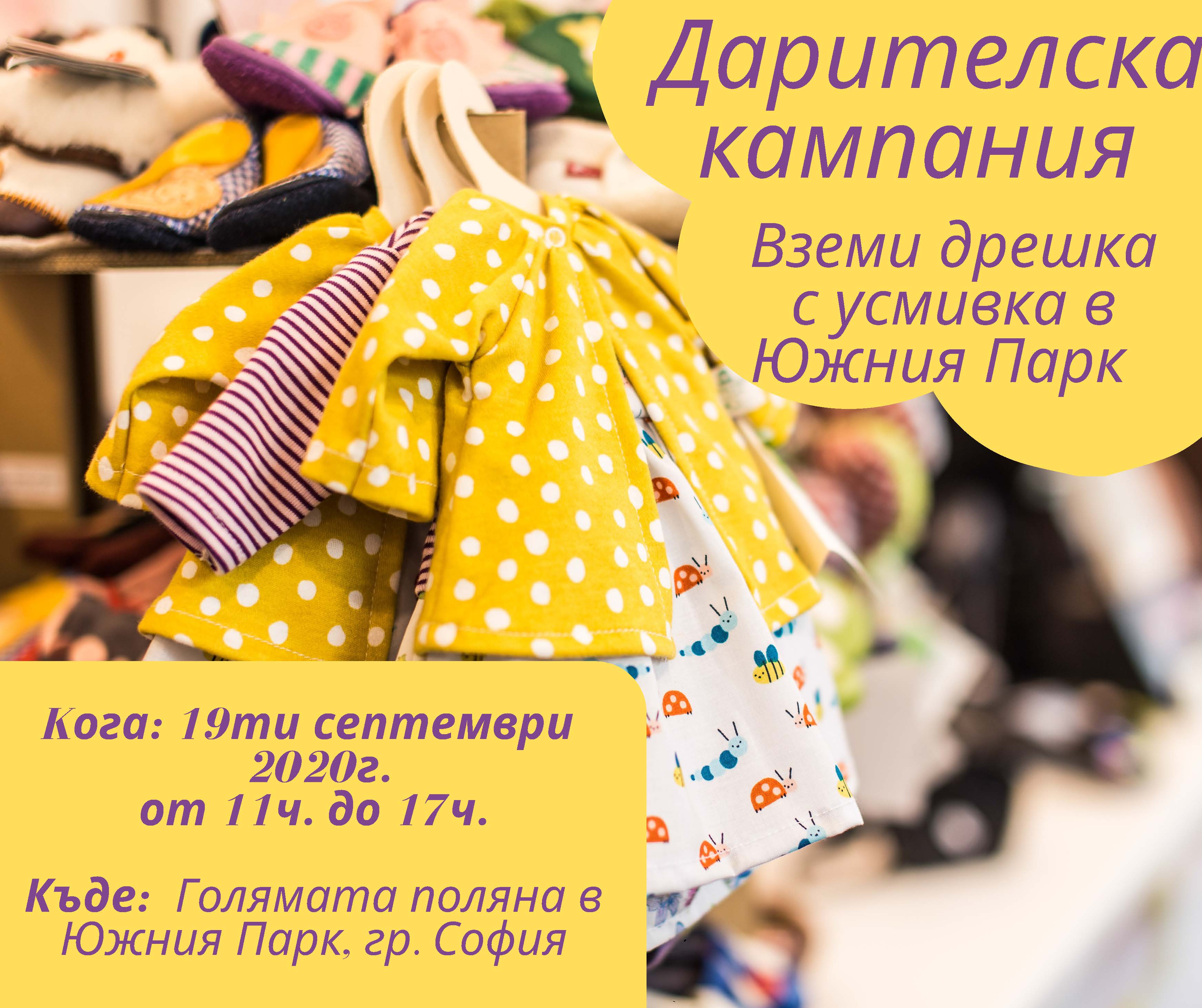 На 19 септември, от 11 ч. до17 ч. на Голямата поляна в Южния парк на София ще се проведе кампания за прекупуване на дрешки от родители, на които ще бъде даден нов живот, за да могат те да достигнат и да зарадват други деца и също така да се спомогне за по-ефективното рециклиране и опазване на планета (чрез принципа "предай нататък").
