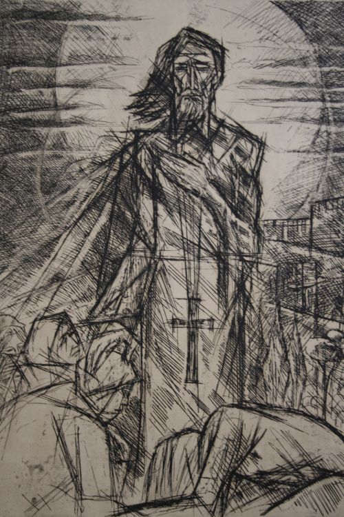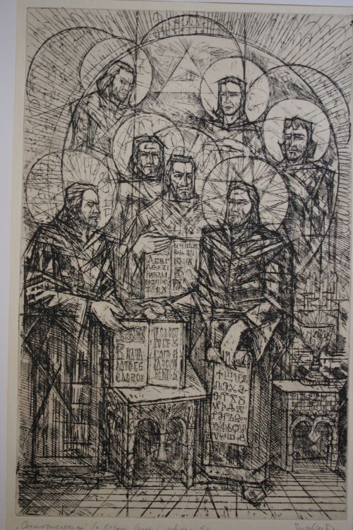 Експозицията, представяща цикъла “Велики българи”, е от седем графични отпечатъка, изпълнени в техниката на офорта – „Константин Философ“, „Седмочисленици“, „Черноризец Храбър“, „Поп Богомил“, „Иван Рилски“, „Патриарх Евтимий“, „Паисий“.