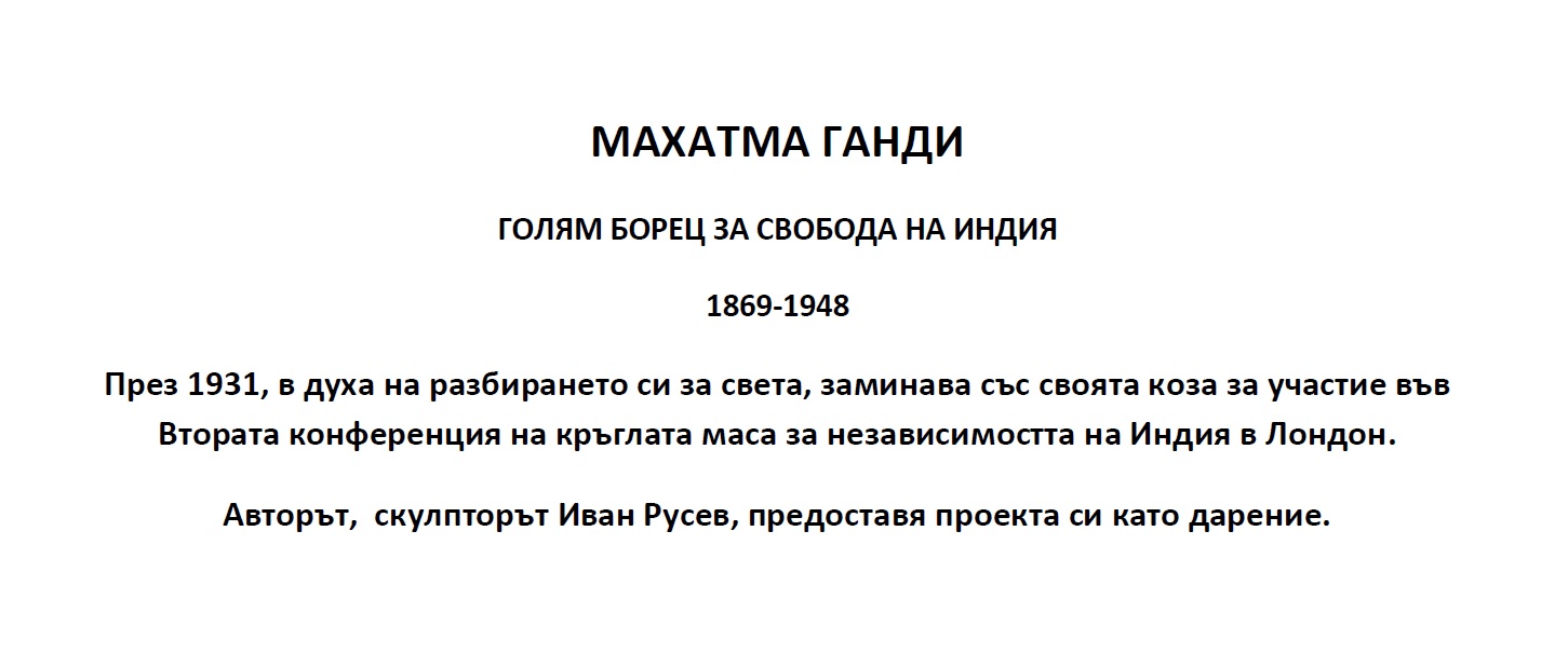 Инвестиционен проект "Паметник на Махатма Ганди" (Представеният проект е фотомонтаж на предвиденото място. Върху месингова табела с размери 30х80 см ще бъде гравиран текст, който ще бъде разположен в предната скосена част на фундамента. Предстои компютърна обработка преди реализацията в материал.)