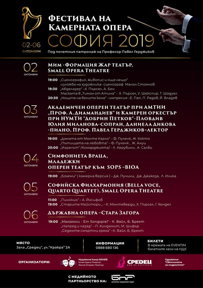 Провежданият за първи път в България фестивал ще запознае публиката с образци на камерната опера от всички музикално-сценични стилове – барок, предкласика, класика, Романтизъм, съвременност, българска камерна опера.