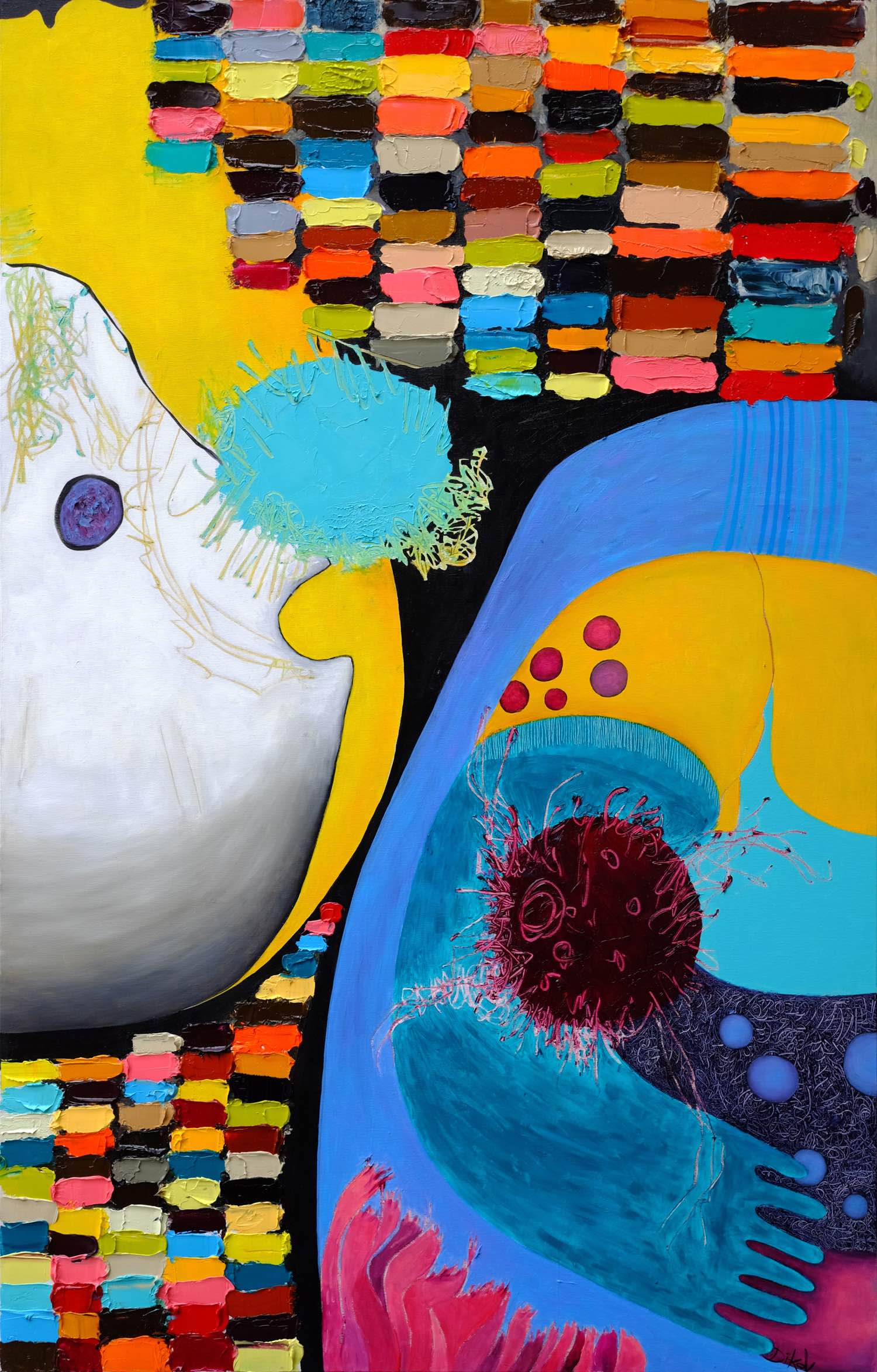 Потопете се. Участвайте. Открийте нови светове. „Рисувам във фигуративен и в абстрактен стил. Състоянията на ума и необятната вселена на подсъзнанието са неизчерпаем източник за моята творческа лаборатория. Изследвам състоянието, в което умът упълномощава тялото да твори, приканвайки обектите с неясно предназначение населяващи подсъзнанието, да излязат на преден план“, казва са себе си Венцислав Диков и допълва: „Връзката между човек и предмет може да е толкова дълбока, колкото връзката между човек и човек, дори по-дълбока. Без вербално общуване остава само есенцията – човекът, чувстващ и отразяващ. Не е необходимо предметът да е с определена функция, за да привлече вниманието на наблюдаващия, точно обратното – липсата на ясно предназначение задейства любопитството. Любопитството създава връзка. Картините нямат смисъл и цел сами по себе си. Смисълът се появява тогава, когато бъде установена връзката.“