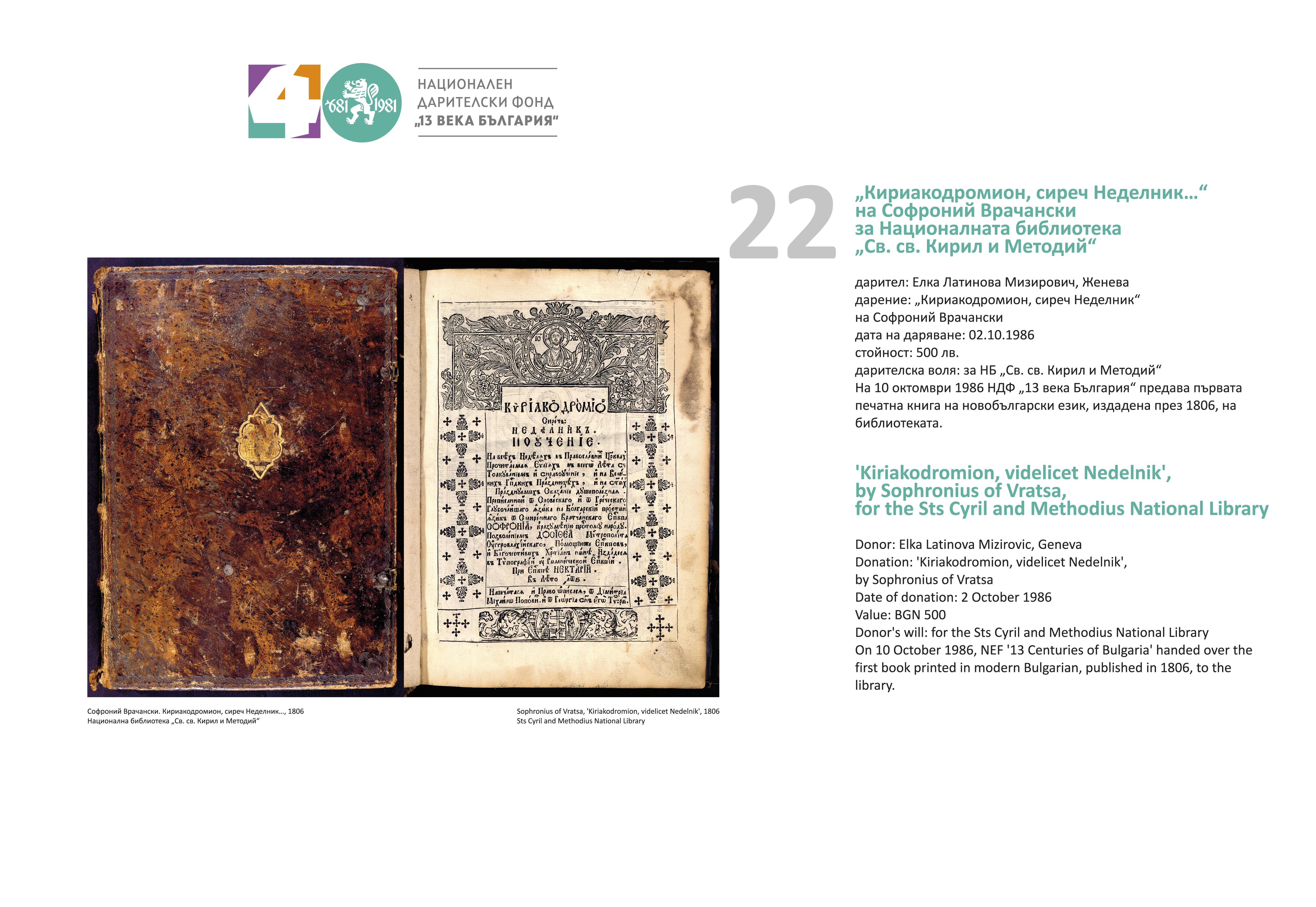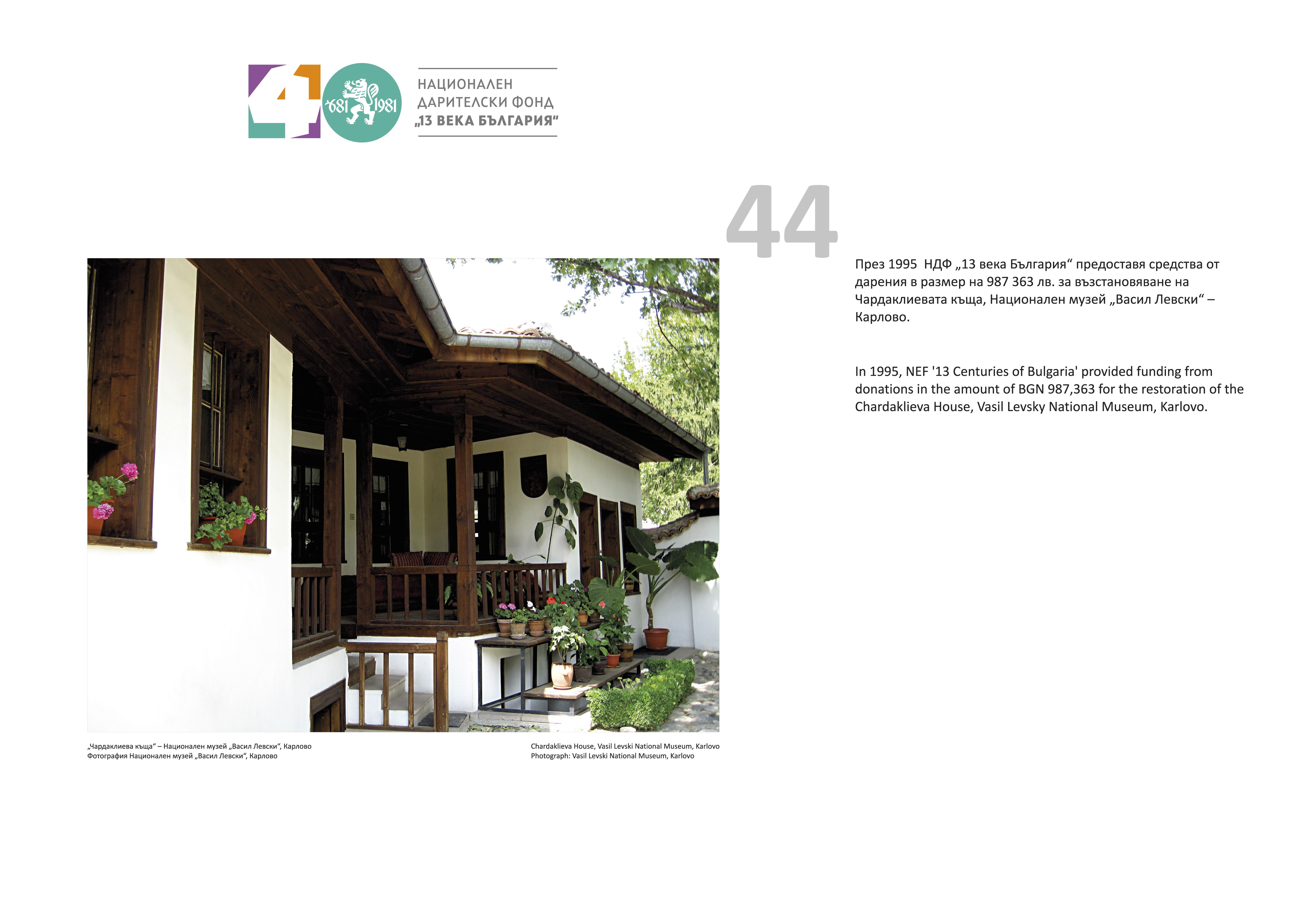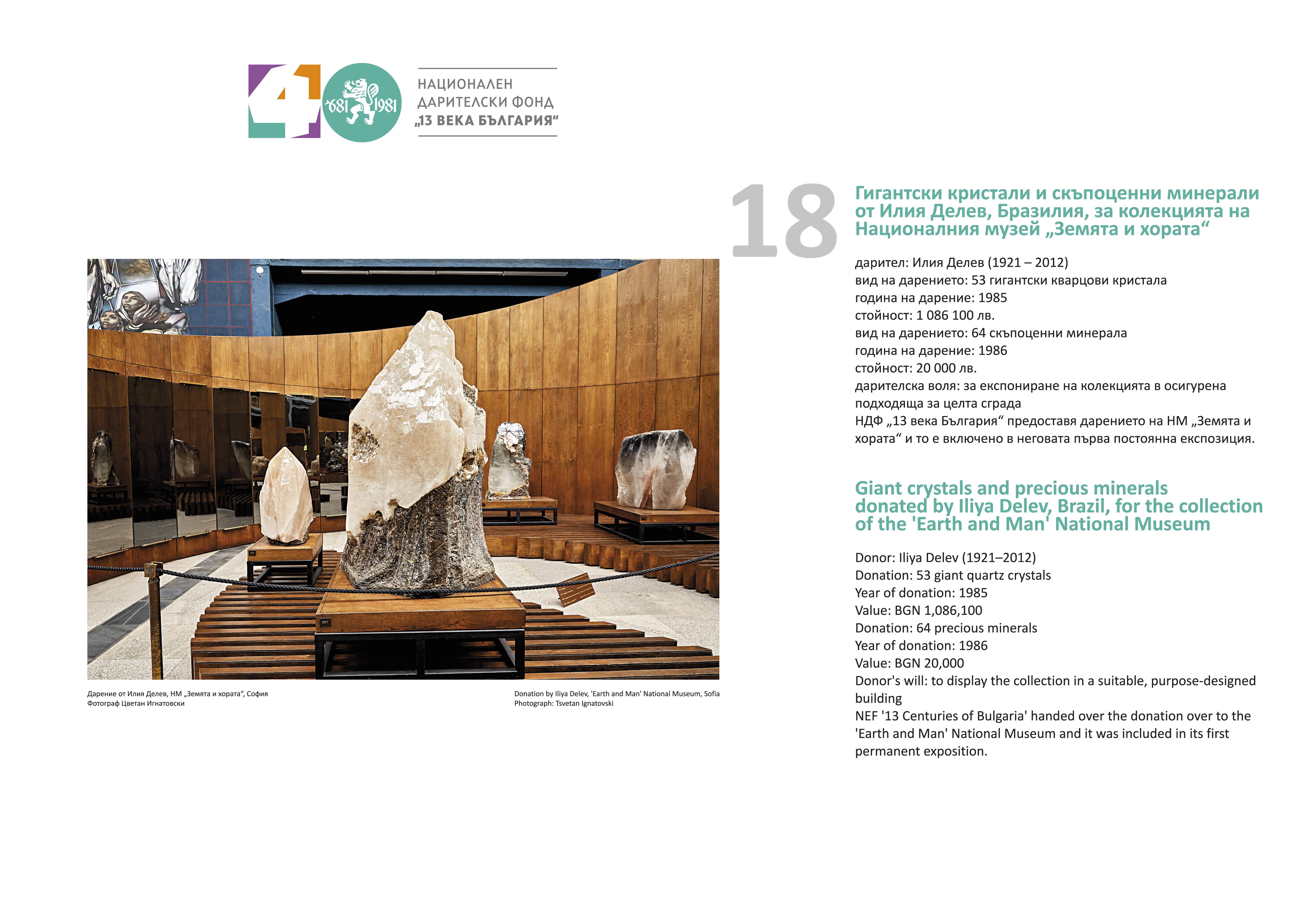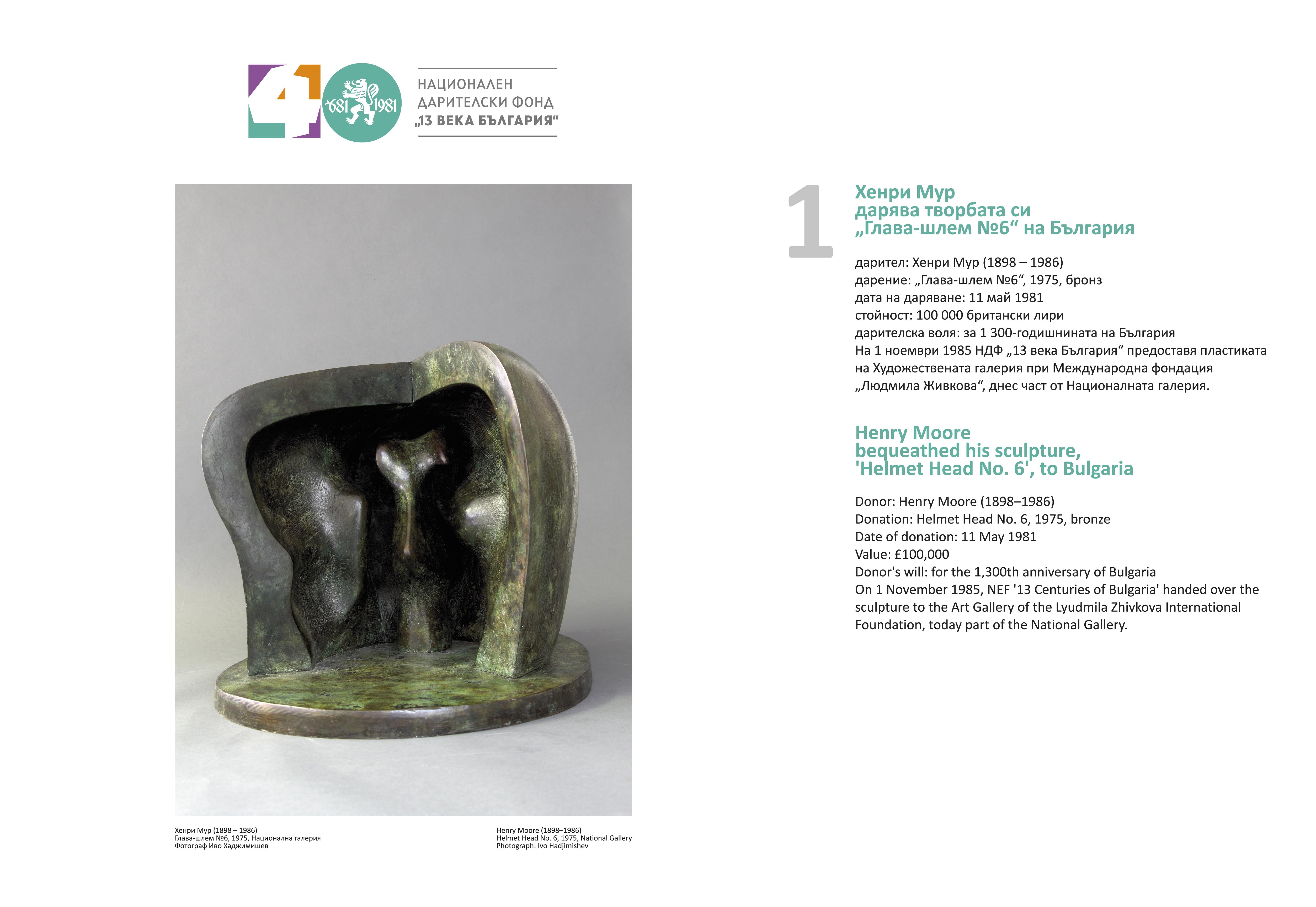 Изложбата проследява 40 от най-интересните, мащабни и стойностни дарения, организирани от Фонда. Сред тях е и първото регистрирано на 11 май 1981 г. – Хенри Мур дарява творбата си „Глава-шлем № 6“ на стойност 100 000 британски лири за 1300-годишнината на България. Текстове и ф.оси разказват за дарители и техните дарения, направени на музеи, галерии, библиотеки, читалища, болници, учебни и детски заведения. Могат да бъдат видени и едни от най-добрите образци на визуалните изкуства и други движими културни ценности, станали част от националното историческо и художествено наследство. През четирите десетилетия на функционирането си НДФ „13 века България“ предоставя и средства от парични дарения за ремонт и реставрация на сградите на университети, библиотеки, театри, музеи, галерии, читалища, зали. Строят се нови. Изграждат се паметници, които увековечават съдбовни събития в многовековната ни история.