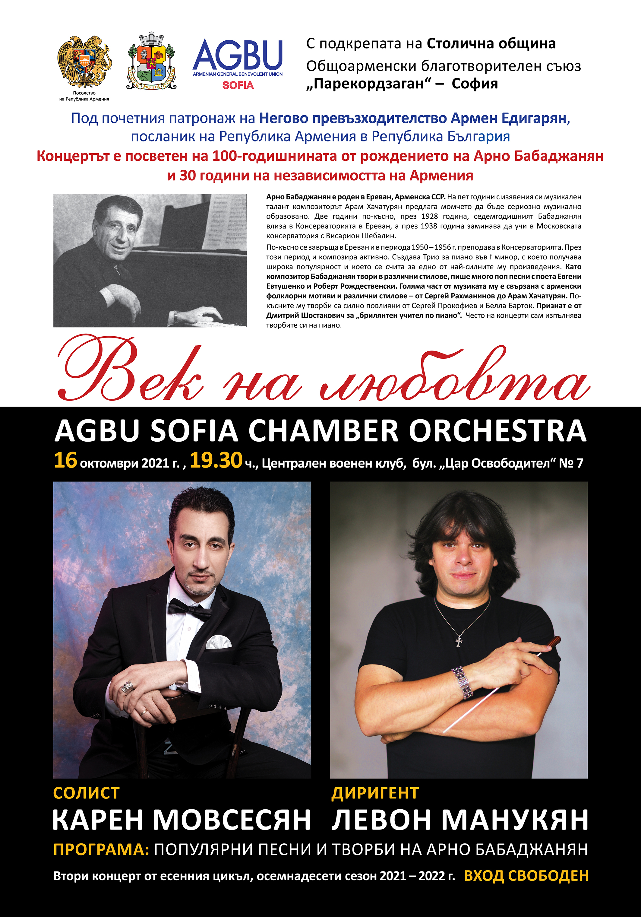Концерт на AGBU Sofia Chamber Orchestra под наслов „Век на любовта“ на 16 октомври