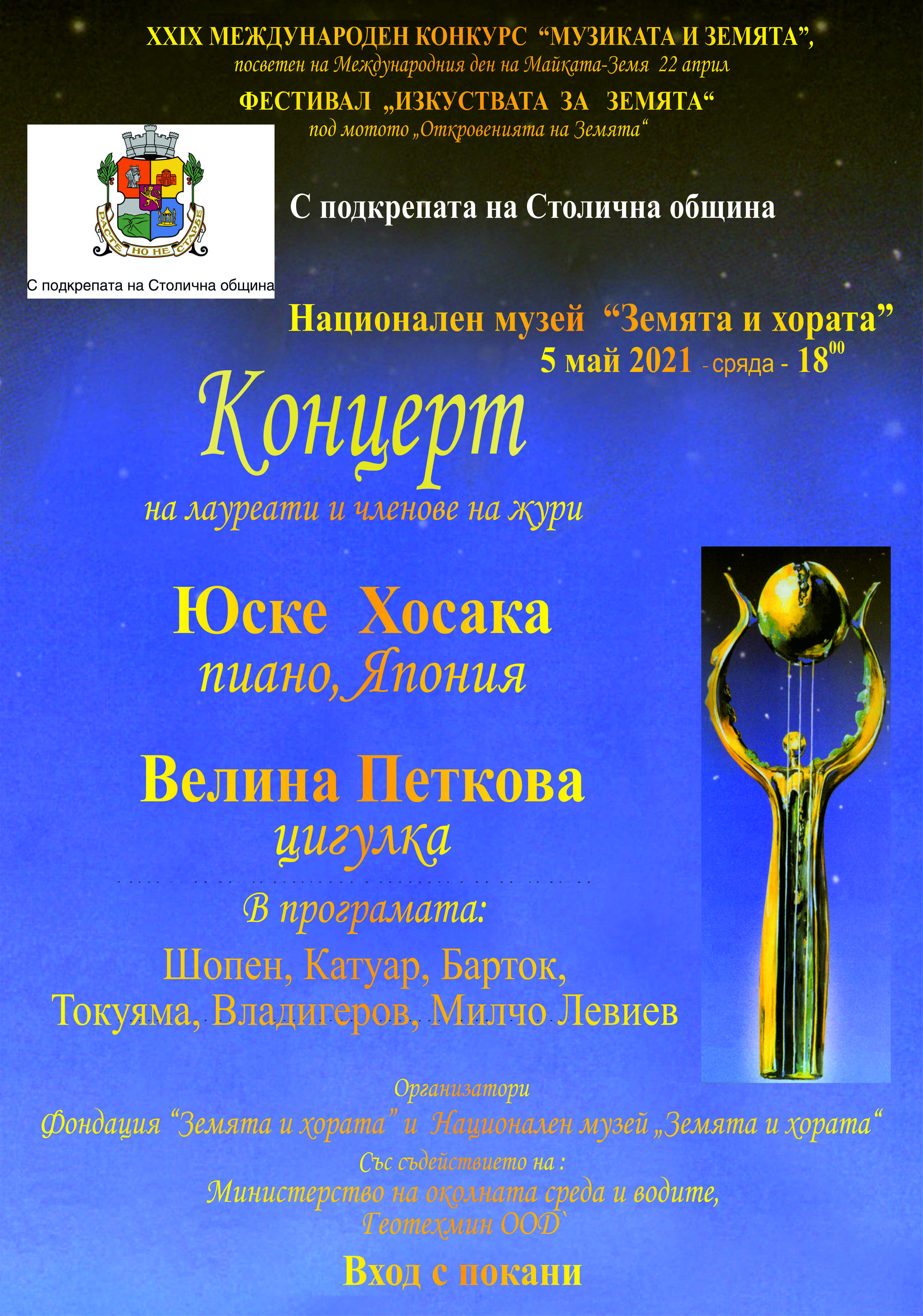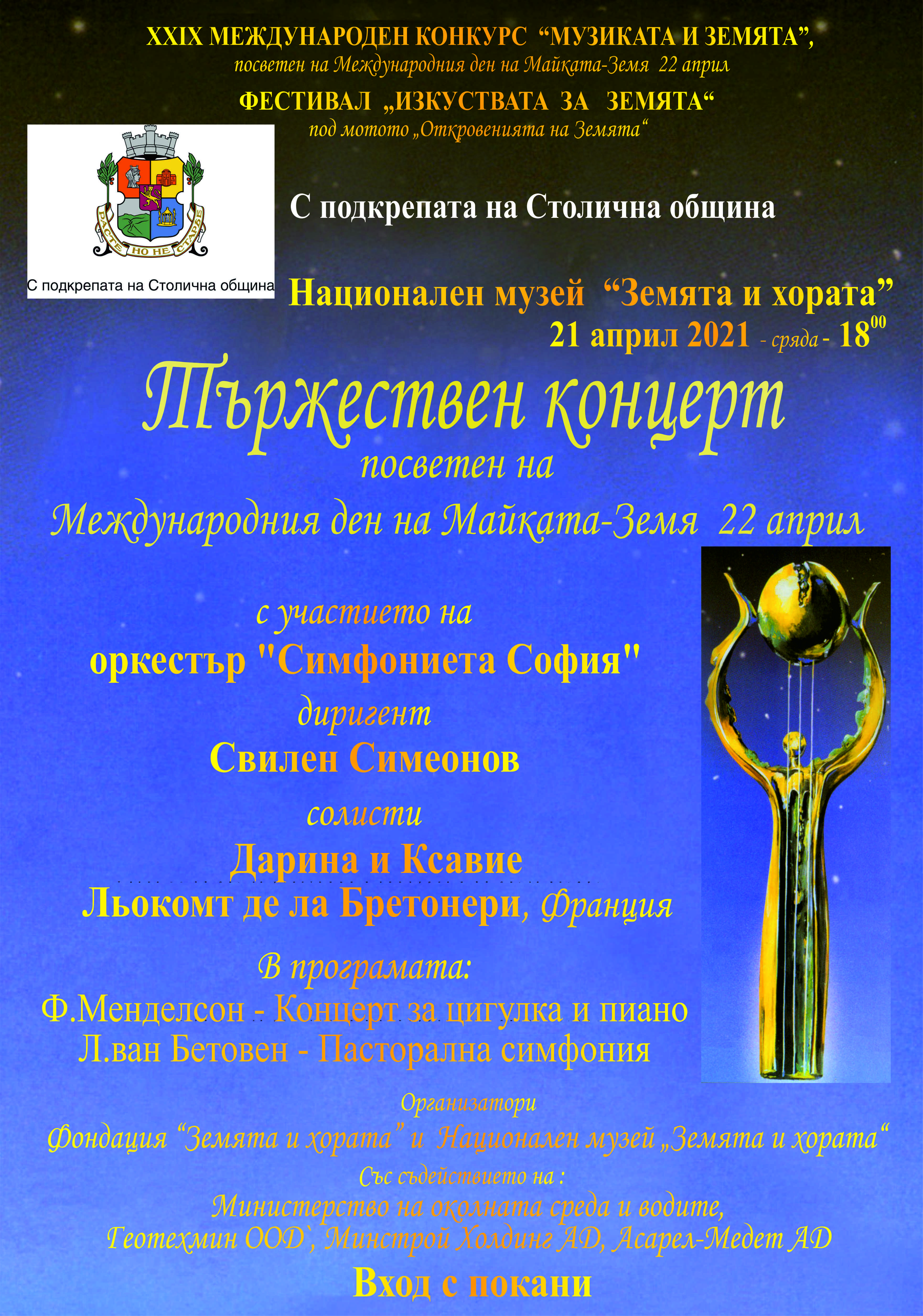 Международният конкурс за инструменталисти и композитори „Музиката и Земята“ се открива на 21 април (сряда) в Национален музей "Земята и хората" с тържествен концерт на Симфониета „София“ под диригентството на маестро Свилен Симеонов Svilen Simeonov. Солисти ще са Дарина и Ксавие Льокомт де ла Бретонери (Франция).