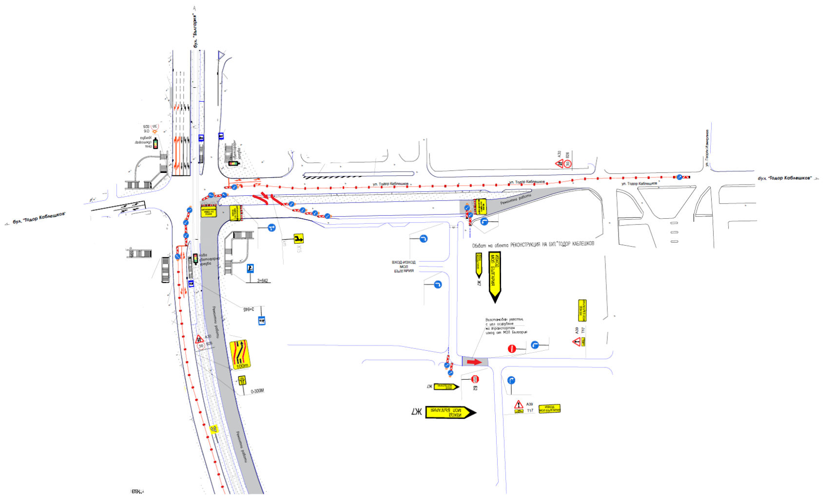 Заместник-кметът Кристиян Кръстев посети обекта на бул. „България“ и обсъди заедно със строителите промяна в организацията на движение на кръстовището с ул. „Тодор Каблешков“. Промяната се налага във връзка със започналите строително-монтажни дейности на мостовото съоръжение, разкриване и монтаж на арматурата, както и полагане на хидроизолация. Новата организация на движение цели да осигури достъп до Мол – България и до намиращите се в близост жилищни сгради. Временното транспортно решение включва затваряне участък на „Тодор Каблешков“ от входа на Мол – България до стеснения участък на улицата (200 метра), преминаване на автомобилите през зеления остров на ул. „Тодор Каблешков“ покрай Мола и оттам по изграден временен път към квартала. Входът през зеления остров се отваря на 22.08. След приключване на строително-монтажните работи прекъснатият участък от зеления остров ще бъде възстановен заедно с попадащите в обхвата на подлеза зелени площи. В зоната няма дървесна и храстова растителност.